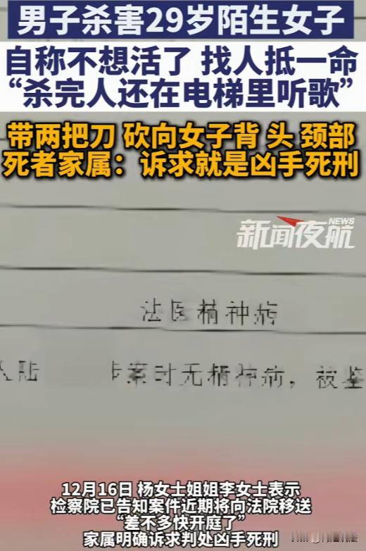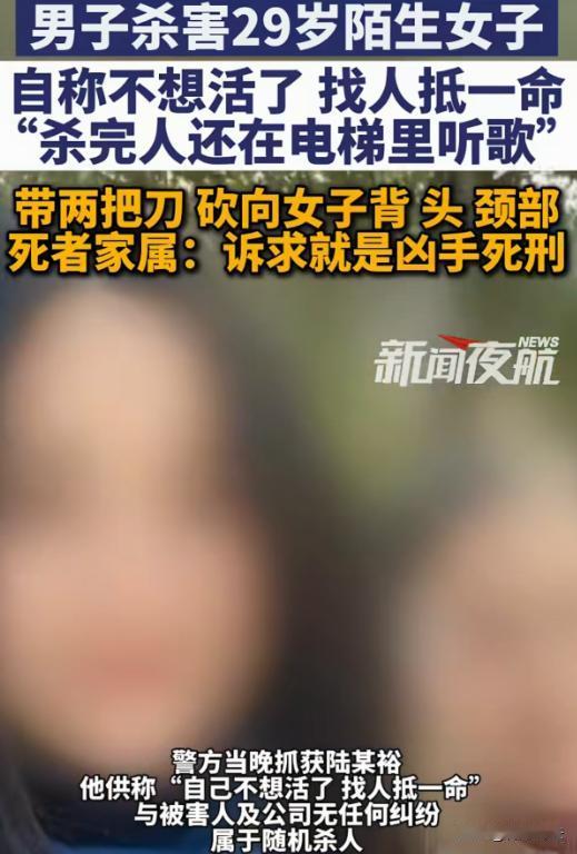 浙江义乌,23岁男子陆某生活不如意,不想一个人死,竟想拉人垫背,他带两把刀冲进公司写字楼,随机选中29岁杨女士,将其刺杀后,又砍伤另一同事,全程仅9分钟。作案后他还在电梯里听歌,当晚被抓,陆某称有精神疾病,可两次鉴定都是正常人,死者家属悲痛欲绝,要求陆某偿命,目前检方将移送案件至法院,很快开庭。 (来源:新闻夜航) 2025年1月5日晚,23岁的陆某生活不顺,竟想拉人垫背一起死,他带着两把刀,毫无目标地冲进公司写字楼。 敲开办公室门,29岁的杨女士成了他第一个下手对象,杨女士还没反应过来就被刺身亡,红了眼的陆某又砍伤另一同事。 整个过程仅9分钟,他作案后竟在电梯里悠闲听歌,当晚就被警方抓获。 杨女士家人接到噩耗时,整个人都懵了。他们怎么也想不明白,女儿平时那么善良,在公司里和同事相处融洽,怎么会遭遇这样的横祸。 一家人哭作一团,杨女士的母亲哭得几度昏厥,嘴里不停地念叨着,女儿走了,自己以后可怎么活。 陆某被抓后,面对警方的审讯,他居然声称自己有精神疾病。他觉得这样或许能逃避法律的制裁,让自己免于一死。 可警方怎么会轻易相信他的话,很快就安排了精神鉴定,结果两次鉴定都显示,陆某是个正常人,具备完全的刑事责任能力。 随着调查的深入,警方发现陆某可不是第一次犯罪,他之前两次进过监狱,刚出来才一个月,就又犯下如此大罪。 这让人不禁怀疑,他是不是根本就没有悔改之心,出来后还是想着继续危害社会。 杨女士的家人悲痛欲绝,他们只有一个诉求,那就是让陆某偿命,他们觉得,陆某的行为太恶劣了,不仅残忍地杀害了他们的女儿,还砍伤了另一名无辜的同事,必须让他为自己的行为付出最惨痛的代价。 陆某在面对即将到来的法律审判时,还在试图狡辩。 他一会说自己当时情绪失控,一会又说生活压力太大,才做出了这样的事,可这些借口在铁一般的事实面前,显得那么苍白无力。 人们纷纷谴责陆某的残忍行为,同时也对受害者家属表示同情,大家都在期待着法律能给出一个公正的判决,让受害者家属得到应有的安慰。 陆某的行为,真的能逃脱法律的制裁吗?他所谓的各种借口,在法律面前能站得住脚吗? 从法律层面来看,陆某的行为已经构成了故意杀人罪。 根据刑法规定,故意杀人的,处死刑、无期徒刑或者十年以上有期徒刑。 陆某蓄意带刀去公司,目的就是想拉人垫背,非法剥夺他人生命的故意十分明显。 他随机选择没有矛盾的人行凶,导致一人死亡一人受伤,手段极其残忍。 而且他在作案后,还冷漠地在电梯里听歌,没有丝毫的悔意,再加上他两次精神鉴定都是正常人,具备完全的刑事责任能力。 他还是累犯,刑满释放一个月就再次犯罪,这表明他主观恶性极深,危害性极大。 综合以上因素,陆某的行为完全符合判处死刑的条件。 刑法还规定,对于累犯,应当从重处罚。 陆某之前两次入狱,刚出来就又犯罪,属于典型的累犯。 这种屡教不改的行为,严重破坏了社会的安全和稳定,必须给予严厉的惩处。 陆某声称自己有精神疾病,但两次鉴定都否定了他这一说法。 在法律上,精神病人的刑事责任能力是有明确规定的。 只有经法定程序鉴定确认的精神病人,在不能辨认或者不能控制自己行为的时候造成危害结果,经法定程序鉴定确认的,才不负刑事责任。 而陆某显然不符合这一条件,所以他必须为自己的行为承担刑事责任。 一些人在遇到挫折和困难时,不能正确面对,容易产生极端想法。 就像陆某,生活不如意就想拉人垫背,这种心态是非常可怕的。 生活中遇到困难和挫折是难免的,但绝不能成为伤害他人的理由,每个人都应该尊重他人的生命,遵守法律和道德规范。 希望能从这起事件中吸取教训,珍惜生命,远离犯罪。