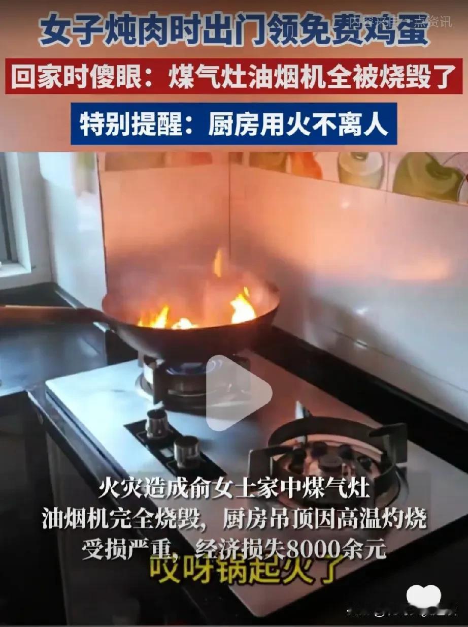 笑不活了,大姐出门领取免费鸡蛋,忘了家里还有炖肉,锅烧干,失火引来消防员。大姐在家炖肉,刷手机看到楼下超市做活动,鸡蛋优惠。她把火调小下去逛超市,在超市忘了家里还开着火这事。邻居看到她家窗户冒烟,赶紧拨打119,幸亏来的及时,火势蔓延比较小,及时扑灭了。油烟机烧毁,吊顶变形,损失点钱。 万幸万幸,只是损失一点点,没有发生大的损失。等她回到家还以为别人家的事,他回到家一看,吓得惊呆了。所以说出门一定把火关掉。