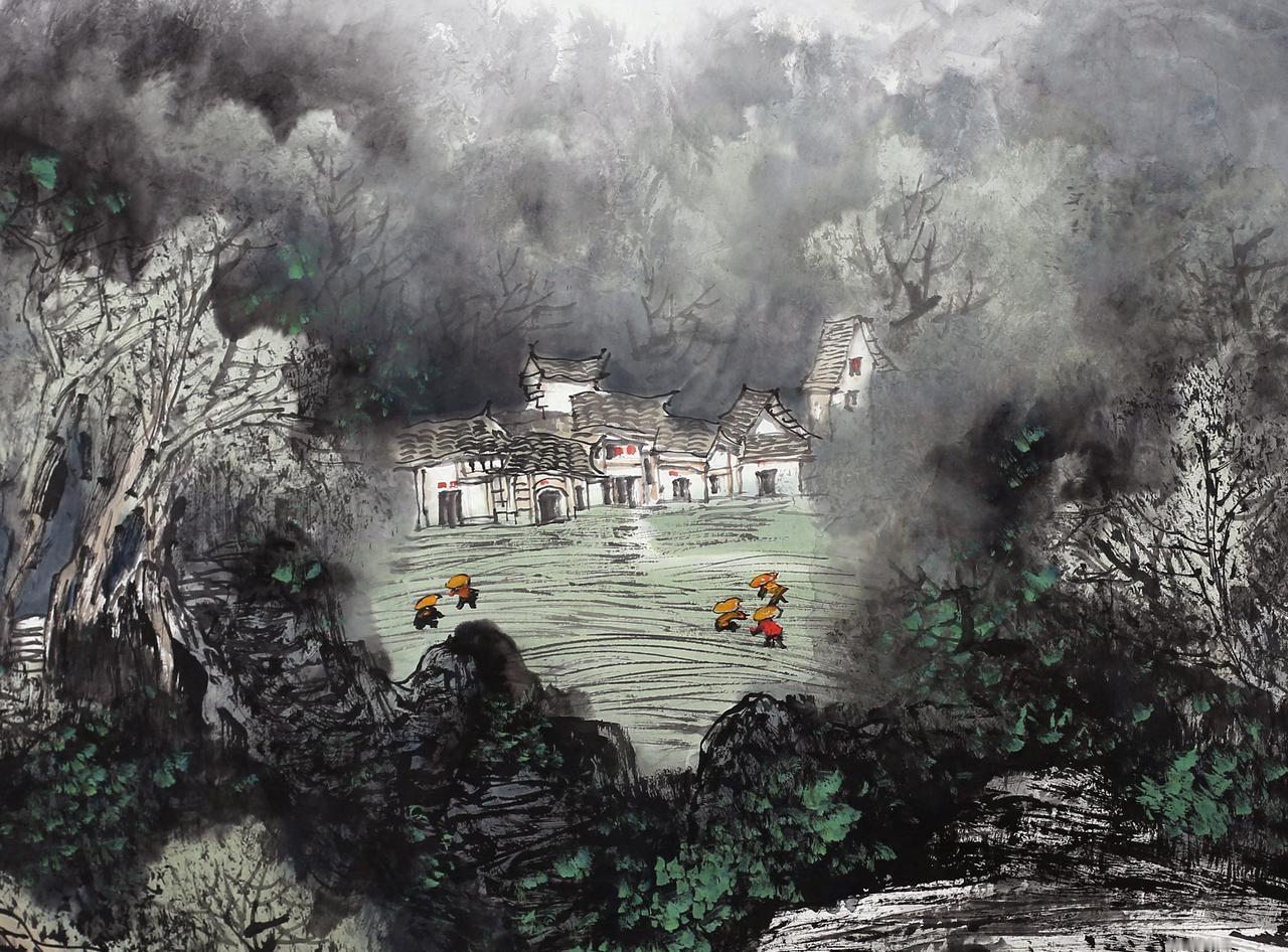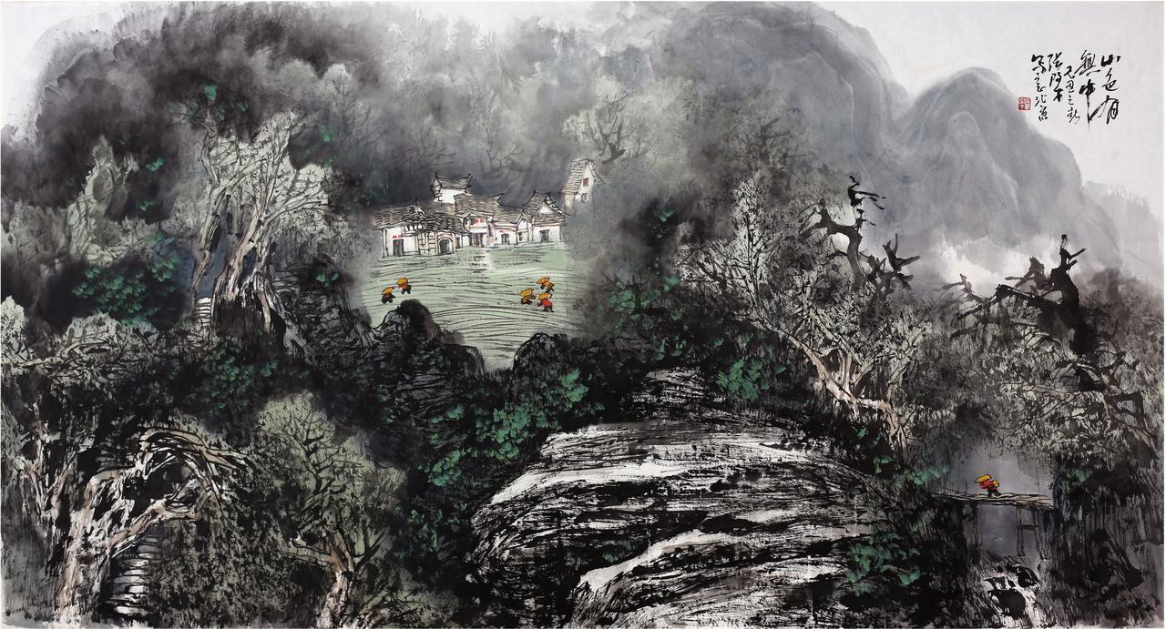 作品赏析:张际才《山色有无中》。 这件作品是作者北京时期的一幅代表作之一,创作于2009年,规格为:97cmx180cm。作品以写实与实意相结合的手法,描绘了赣南山区客家村落春日劳作一个生动场景,将观众的思绪引向那遥远而熟悉的故乡,意境幽远,如梦似幻,成为人们精神家园的象征。 作品采用了经典的“浅绛山水”风格,以水墨为基调,辅以淡雅的色彩,兼工带写,虚实相生,远山虚处的渲染与近景重墨的勾勒相益得彰,山色有无中,构建了一幅既有层次感又不失整体和谐的山水图景。 在构图布局方面,巧妙地将人物活动与自然环境相融合,层层递进,远处山峦的朦胧轮廓、烟云的飘渺,与近处树木的繁茂翠绿、小桥流水形成对比,半包围式的构图,既突出了家园这一画眼,又赋予了画面一种空灵深远的美感,营造出一种宁静而富有生机的氛围,让人仿佛置身于那清新脱俗的田园之中。 《山色有无中》展现了画家深厚的艺术功底和对传统山水画的创新探索,也反映了他对故乡赣南的深厚情感和对自然美的独特领悟,它以其独特的艺术语言,引发了观者对自然、对生活、对精神家园的深度凝视。 文/庄鲁