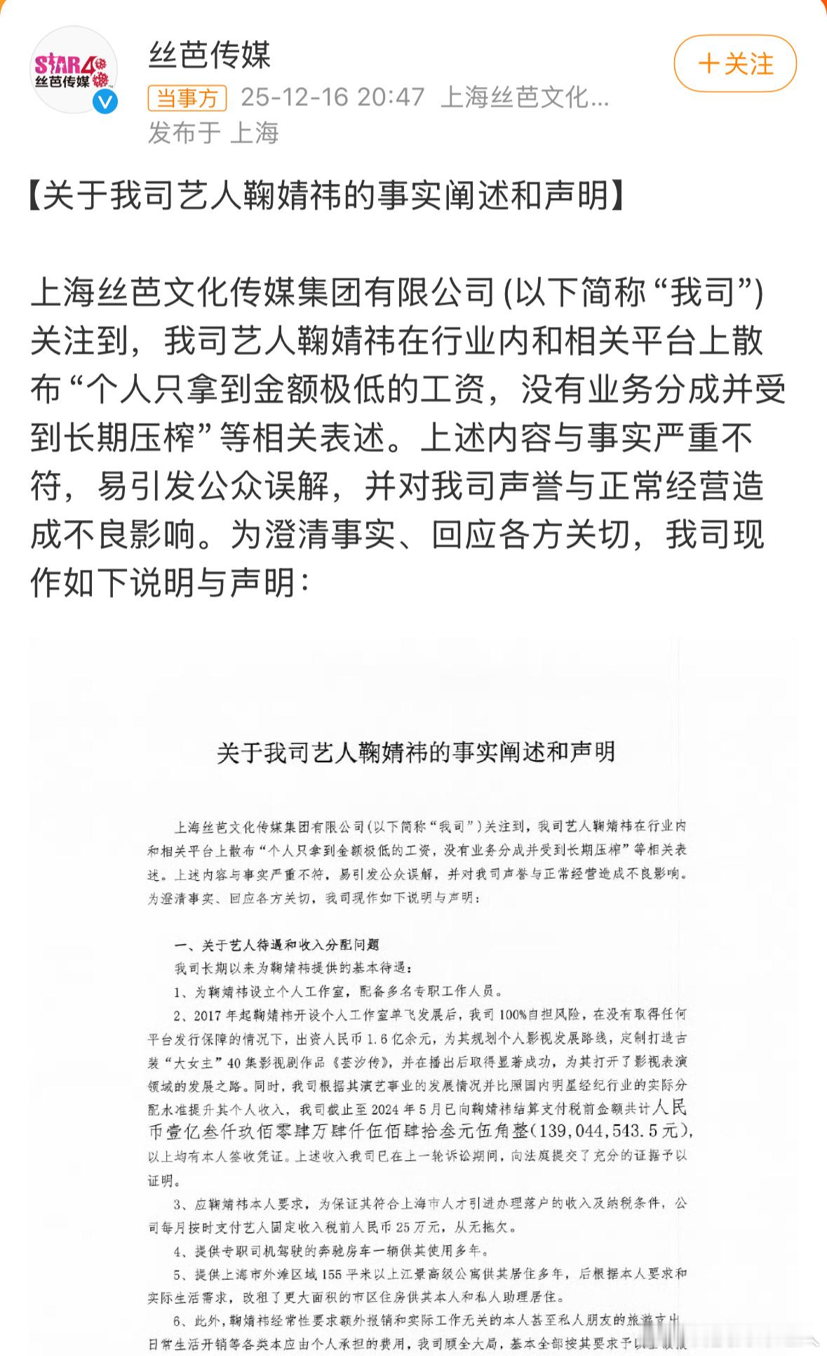 鞠婧祎每月25万元固定工资小鞠早就该单干了,1.39亿看着是普通人遥不可及的天价,放在明星圈层里真不算拔尖,甚至不少头部网红一年都能赚到这个数,更别说顶流女星的量级了。更何况这还是包含运营成本的税前结算款,11年税后实际所得不足8000万,而她一人贡献了丝芭35%的年营收,却只拿到15%-20%的分成,收入和价值严重不匹配,有点离谱了丝芭。