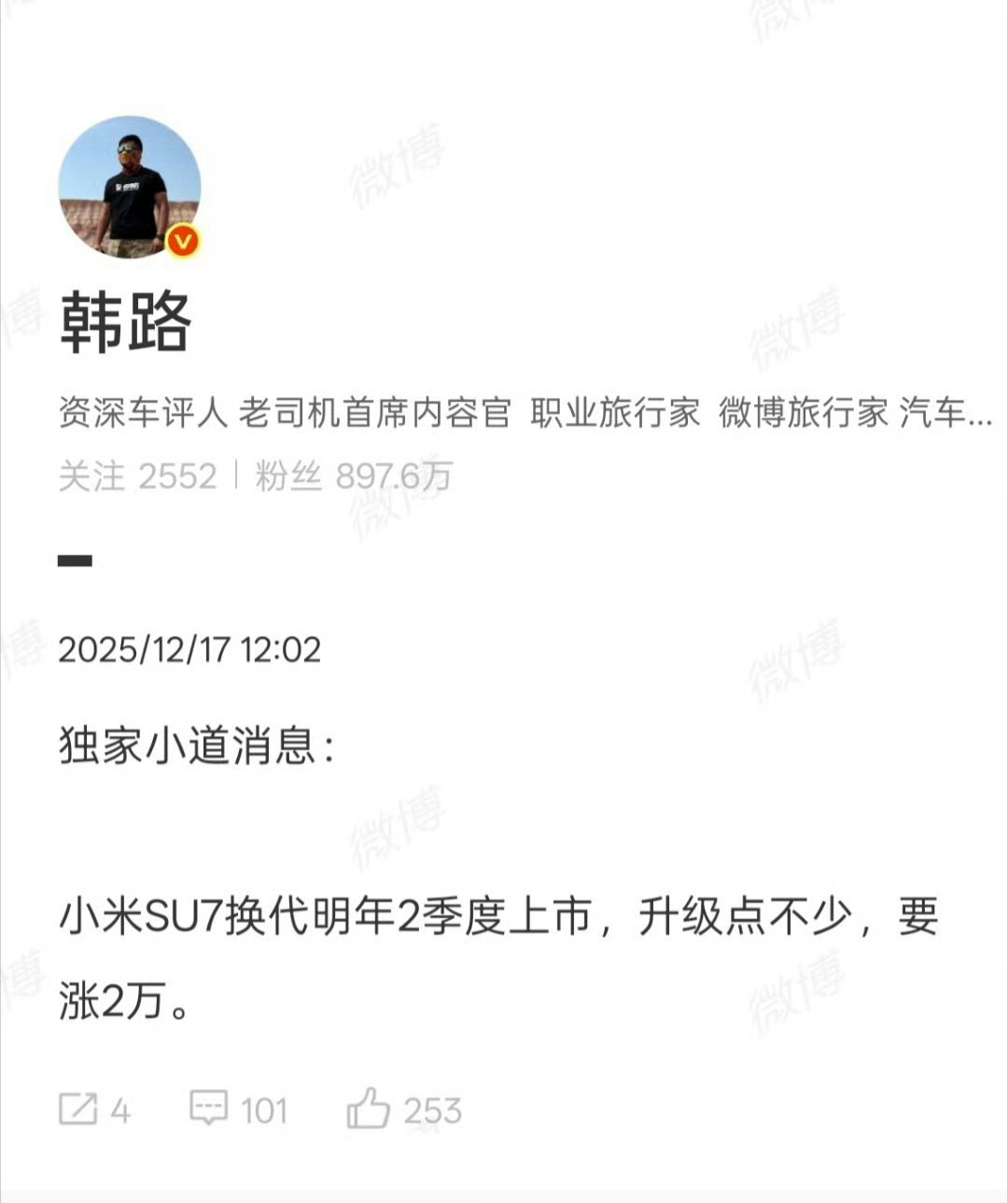 小米SU7换代或涨价2万元刚刚韩路爆料了su7迭代款上市时间和涨价。其实涨价这个事情很正常,首先我们都知道su7迭代款一定会有一个巨大的升级之前曝光的信息,车身电气架构、辅助驾驶、内饰都会有比较明显的升级,光是这些成本就上去了。再叠加一下锂电池原材料价格飙升,碳酸锂、六氟磷酸锂半年涨幅超50%,新能源车有很大的涨价压力总的来说就是,买现款就是早提车+便宜;等新车就是贵一些+时间晚,看你更需要哪个,不用纠结小米新一代SU7明年二季度上市