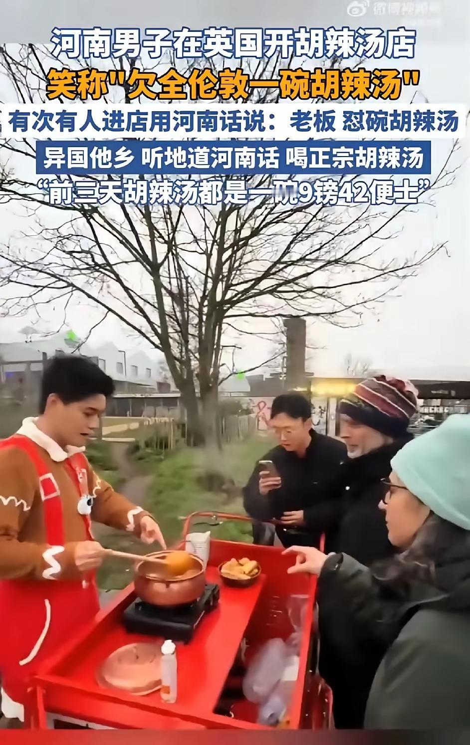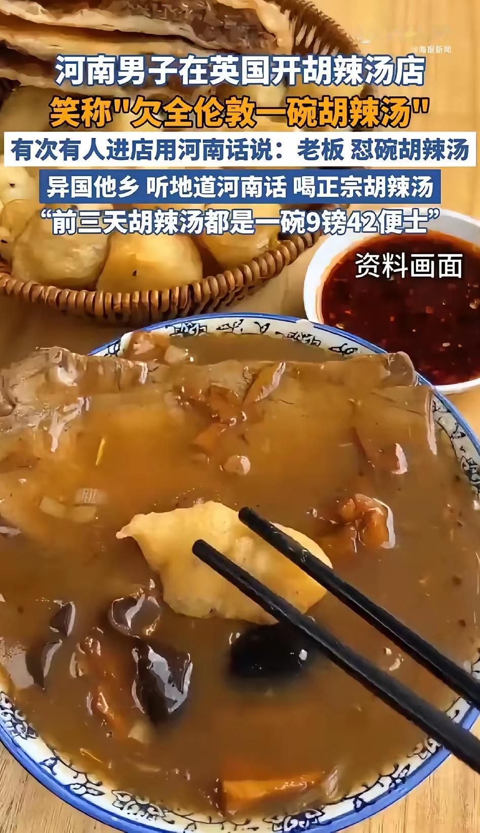 河南小伙伦敦开胡辣汤店,地道风味3天圈粉300+食客 一位河南小伙将家乡特色美食胡辣汤带到了英国伦敦,在当地开出了一家风味地道的胡辣汤店。新店开业仅3天,就凭借独特的麻辣鲜香口感吸引了超过300位食客到店品尝,让海外华人尝到了久违的家乡味,也让外国友人体验到了中国传统小吃的独特魅力。