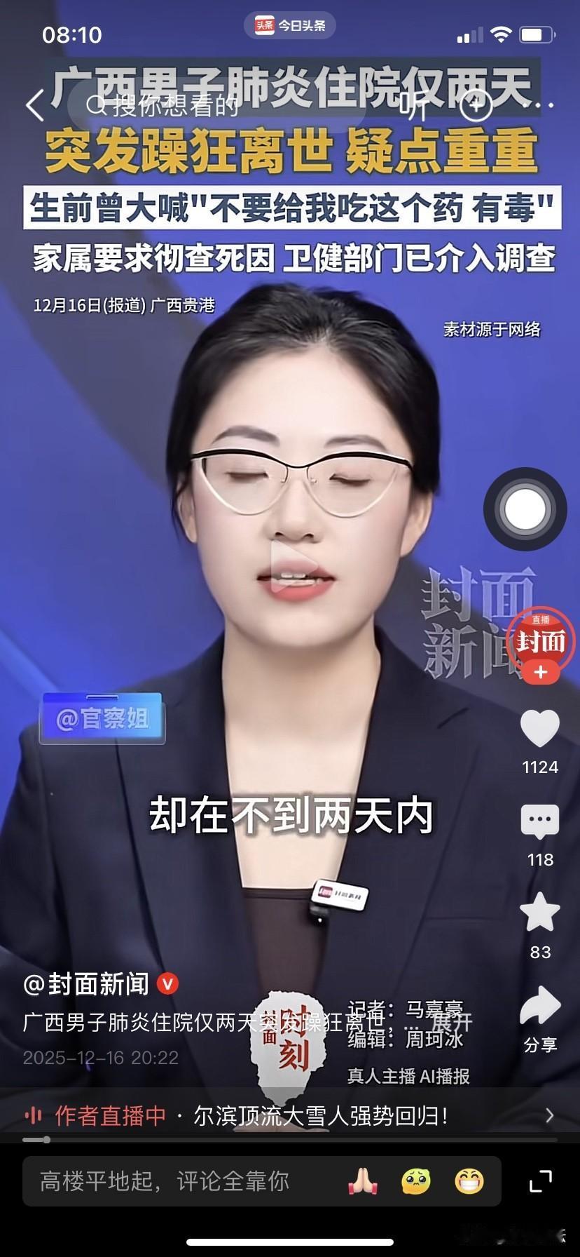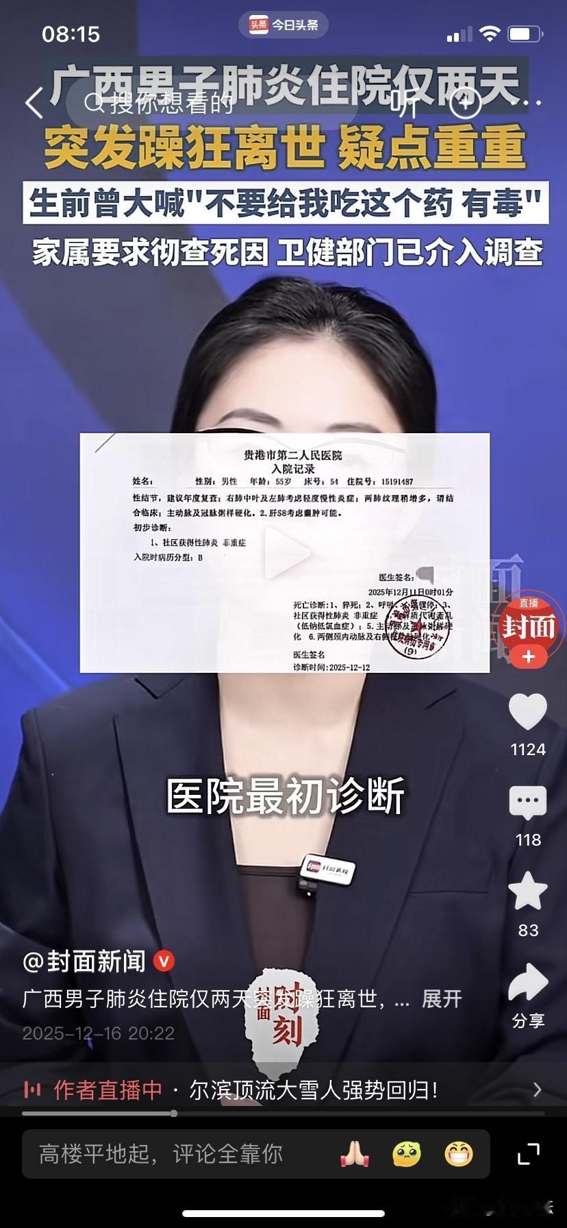太离谱了,男子在医院吃错药不幸死亡 2025年12月12日,据多家媒体报道,广西55岁的安某在广西第二人民医院仅仅住院两天便宣布死亡。 据死者的女儿称:父亲是2025年12月10日下午,父亲因肺炎住进了广西第二人民医院,最初医院诊断为非重症肺炎。12月11日傍晚,医院让父亲吃了一种地西泮药以后,父亲便出现了严重的狂躁症,经常情绪激动。父亲以前从未得过精神疾病,所以,父亲一直是拒绝服药,让父亲服药他一直大喊:不要给我吃这个药,这个药有毒。 最后,医院见父亲病情没有好转反而加重了,就建议父亲转院治疗。然而,父亲还未来得及转院,就因抢救无效宣告死亡。 目前,家属要求彻查父亲死因,卫健委已介入调查。