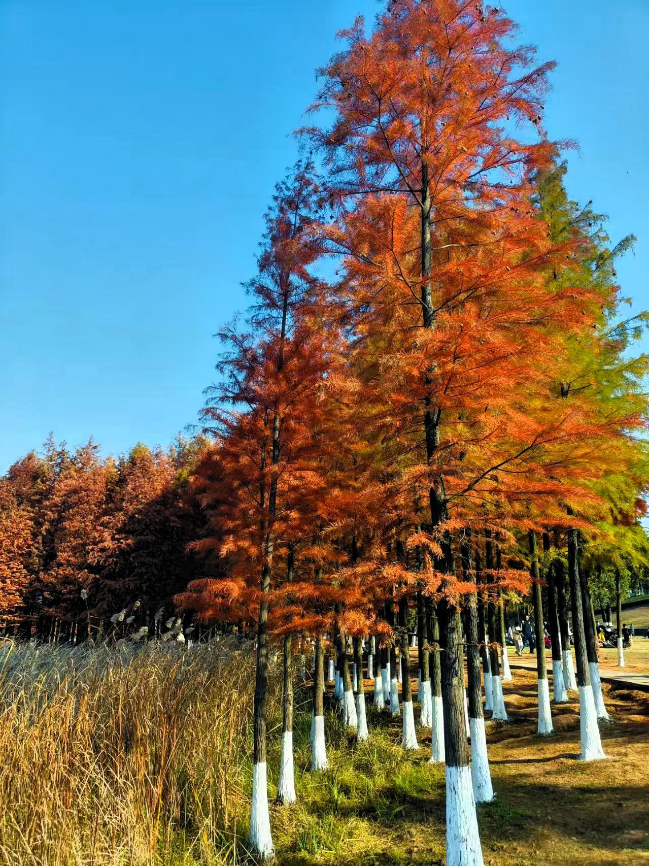 今天出门邂逅这片水杉林,蓝天为幕,红杉似火,像打翻的颜料盘。 阳光透过枝叶,暖烘烘地洒在身上,身旁草叶沙沙,远处人影悠悠。 尘世的烦恼被这景色碾碎,风里都飘着治愈的味道,感觉心灵被好好熨帖,满是轻松,原来大自然的拥抱,能把疲惫全赶跑,这趟出行太值啦~