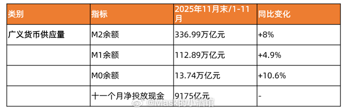 这次大跌的原因藏在了最新的金融数据里!周二大盘延续弱势低开低走,市场继续缩量调整,以科技为主的创业板领跌。上证指数:收报3824.81点,下跌1.11%。深证成指:收报12914.67点,下跌1.51%。创业板指:收报3071.76点,下跌2.10%。科创50指数:收报1293.38点,下跌1.94%。沪深两市总成交额为1.72万亿元,较前一交易日缩量492亿,市场交投热情降低。全市场1091只股上涨,4300多只下跌,前期热门板块集体弱势赚钱效应极差。很多人猜下跌的原因,一是资金在为日元加息做准备,二是最新的金融数据较疲软,后面会详细解读。亚太的股市这两天表现都很差,主要是对冲基金抢跑提前卖出日经和港股的科技公司。高盛数据显示,华尔街对冲基金在上周12月8日-12日左右,大幅抛售了日本和香港的股票,尤其是科技股。日元加息在即,现在的全球大资金正在做两件事。一是躲避AI泡沫的破裂,二是押注日本央行利率上升带来的传统行业红利,日经中的银行保险都会从加息中收益。日本央行在2025年1月24日的货币政策会议上将政策利率从0.25%上调至0.5%后,瑞穗金融集团、山口金融、北太平洋银行涨超2%,三菱日联金融也一度涨超3%。日本东证银行指数一度上涨2.8%,为33个行业类别中涨幅最大。这次日元继续加息,这些传统金融行业会受益。对于普通散户而言,现在激进追高不可取,在策略上至少是“防守”到日元加息落地。白酒板块微跌0.2%,还在慢慢爬坑,能维持住一个区间微涨微跌就行。好消息是这周茅台和五粮的股息就到账了,这笔股息我是准备继续加到五粮中。股息复投是红利股赚钱的很重要的一环。把白酒会暴涨的想法抛开,白酒真的是个很不错的红利公司。不像制造业每年需要大额的资本投入,也不像科技行业每年需要大量研发投入。赚得钱都是现金,而且是可以自由支配的现金。未来10年内饮酒人群能维持一定的规模,茅五泸公司业绩会下降但不会崩盘。茅五泸把每年赚取的90%利润全部分了,叠加美元降息国内降息,白酒的分红就会越来越有价值。现在投资白酒未来是通过分红把钱赚回来的。最新的11月金融数据已经发布了,我们来逐一解读下。先看下表最重要的三个数字,11月的M1-M2剪刀差=-3.1%。而10月末M2与M1剪刀差为2.0%,剪刀差由正转负意味着资金的活跃度在下降。11月剪刀差为负,市场上的"死钱"增多,企业和居民更倾向于储蓄,减少消费和投资,经济活力减弱。在消费数据上也体现了,11月的居民消费价格环比下降0.1%,消费在萎缩。从10月和11月的大盘月线也能看出端倪。月线上10月沪指上涨1.85%,11月下跌1.67%。资金活跃度下降很容易就扩散至敏感的证券市场。2025年1-11月,M0余额为13.74万亿元,同比+10.6%,M0是实体现金,10.6%的高增速说明居民/企业年底对现金的持有需求上升,到了年底消费旺季现金交易需求增长,以及风险储蓄增加。2025年1-11月净投放9175亿元,说明央行等机构向市场净增投现金,配合M0高增速,为避免年底资金紧张,央行主动增加现金供应。目前11月的数据对于股市而言不算好消息,我们也在前面的文章提过年底的大A会特别难做。再来看社会融资规模增量(2025年1-11月)的数据。实体经济的贷款增加14.93万亿,但同比少增1.28万亿,意味着实体经济在收缩,企业主的投资意愿不强。 政府债券净融资13.15万亿元,同比多增3.61万亿元,去年1 - 11月为9.54万亿元,是社融同比多增的最主要贡献项,这是今年政府工作报告中提出实施更加积极的财政政策的数据体现。民间投资少了,为了跨周期调节,政府就挑起了大梁,通过债券融资,为基建投资、民生补短板等领域提供资金。再来看人民币贷款情况1- 11月人民币贷款总量达271万亿元,同比+6.4%。贷款总量正增长说明金融体系对实体经济的信贷供给仍在扩张。从结构上看,资金优先流向企业部门支撑实体投资/生产,占人民币贷款新增的绝对大头,同比增长约4%,增速虽温和但总量可观。实体经济投资动能依然存在,国企和优质民企在政策引导下持续获得资金支持,有助于推动产业升级和经济增长。住户贷款新增额同比大幅下降近1.8万亿元,降幅达77%以上,可以说是大崩了。至少反映了三点:1.居民购房需求疲软,房地产市场持续调整;2.消费信心不足,居民更倾向于“存钱”而非借贷消费;3.高房价、高利率、就业不确定性等因素抑制了信贷需求。在高失业风险下,居民没人敢轻易负债了。居民在经济上升期的加杠杆行为,可以说被这两年的经济下行彻底扭转了,大家都在拼命的卸杠杆存现金。但是这些数据已经成为过往,不能根据过往的悲观数据推导未来经济一定悲观,这种线性思维不可取。经济形势很差已经是众所周知,但是大机会往往藏在经济由坏转好的那个时间节点。而且从数据上看,上面的财政政策和货币政策都在发力。 尽量用周期性思维思考,经济差到极致就没有下降区间了,未来就会逐渐转好。极度悲观者不适合投资!风险提示:短期涨跌不预示未来,如提及个股或基金不代表投资建议。投资需谨慎。基金 A股超话财经基金