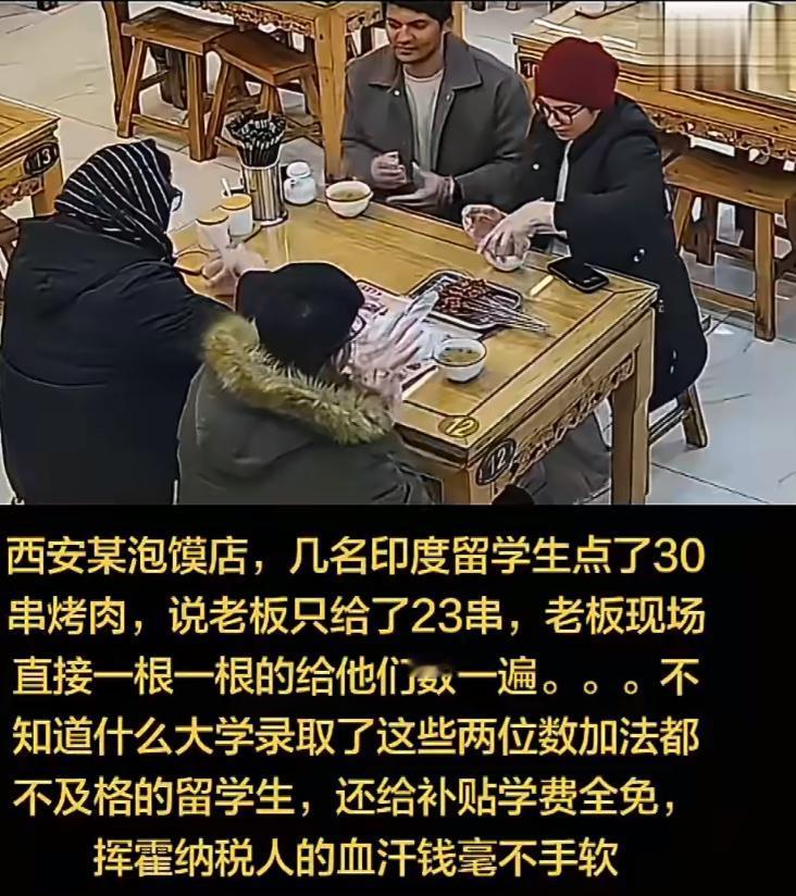 有没有搞错?又想着占便宜! 在西安的4名印度留学生,去一家泡馍店聚会吃饭,本来他们一共点了30条烤串,店家帮他端过来之后,他们还拿起上面的烤串一条条数,数了一遍后说只有23条。老板心想不对劲,就当着他们的面数一遍,就是30根。 这就是K签证招进来的人才?都不会数数,怎么当的留学生,学校还能接受?门槛这么低吗? 另外提醒店主,阿三抓过的铁签子不恰当处理的话,一定会影响生意。 就是想骗吃骗喝罢了!中国人对印度人这样的没有素质的国家来客,没有必要客客气气,而是应该严格要求,否则只能自食苦果。 这都是造孽呀,谁给我们弄来这些玩意,在我们家里作威作福,嚣张跋扈,这种印度人驱逐出境吧!