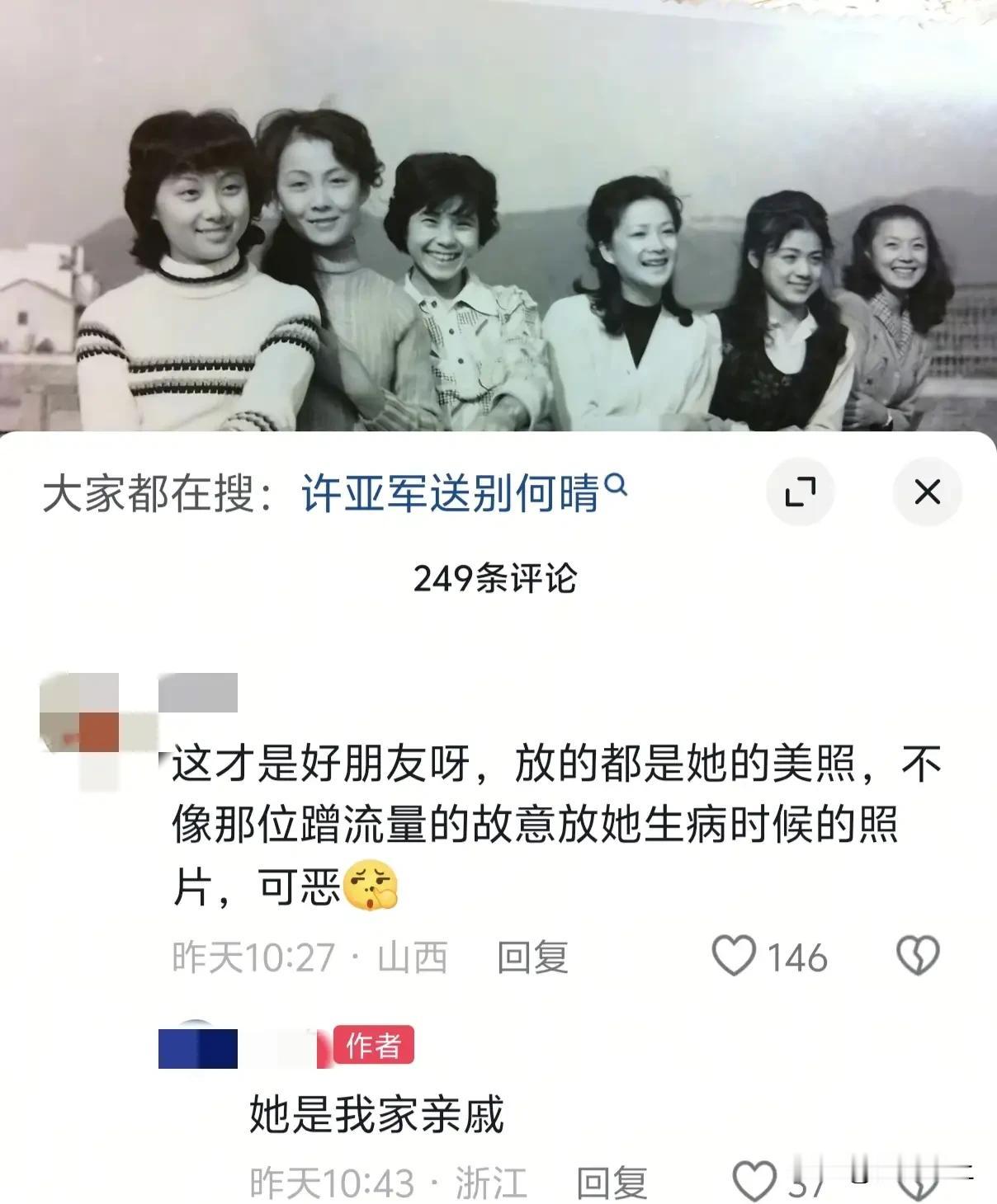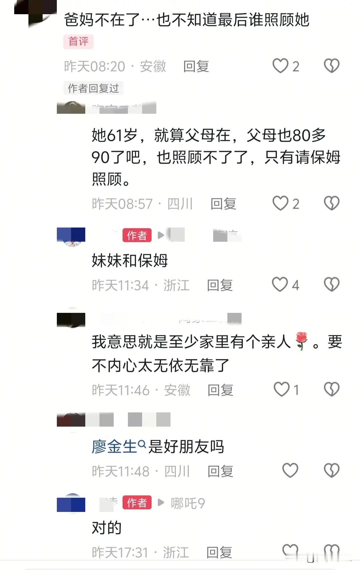 最近看了何晴老师生病期间的照顾情况,有点唏嘘。 她妹妹小她四岁,平时照顾她最多,买菜做饭收拾屋子,保姆也帮着搭手,俩人为了她的日常起居,一天到晚没闲过。王卫国是多年邻居,住一个院子里,她要是突然不舒服,打个电话他就来送医院;儿子许何24岁,搞演艺事业忙,偶尔抽空来看,待不了两天就得走。 人这一辈子总替别人考虑,可最需要帮助时,能一直守在身边的,不就是这些默默付出的亲人朋友吗?