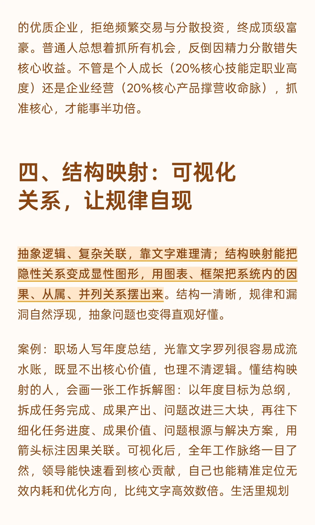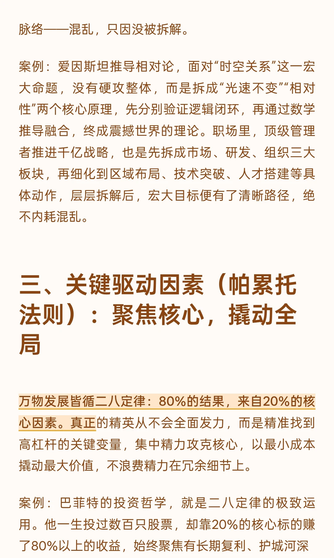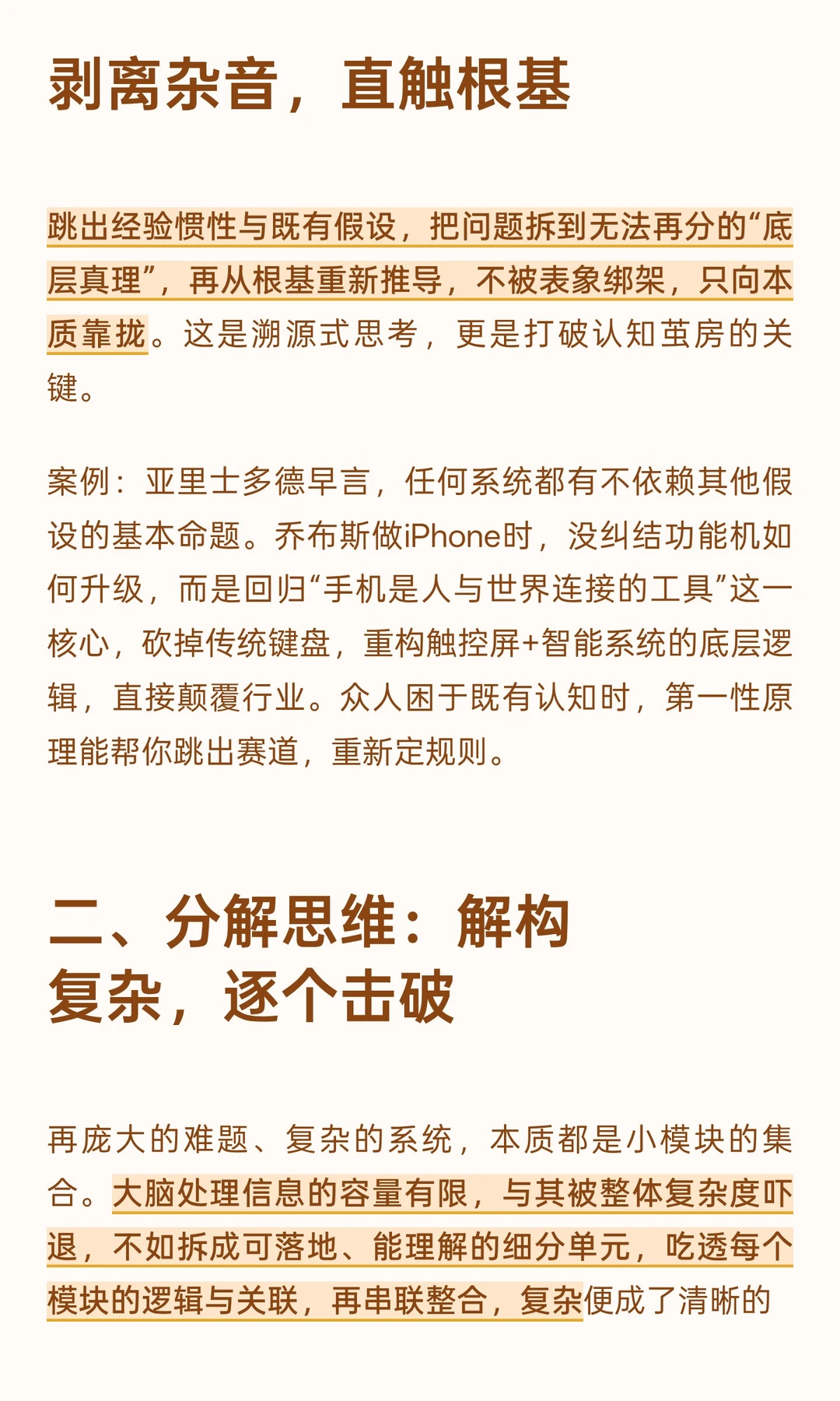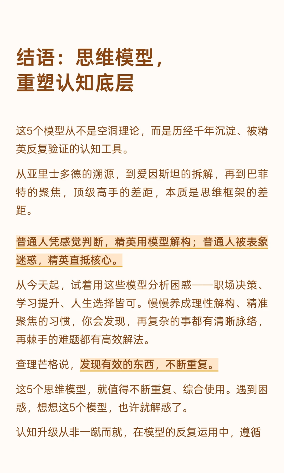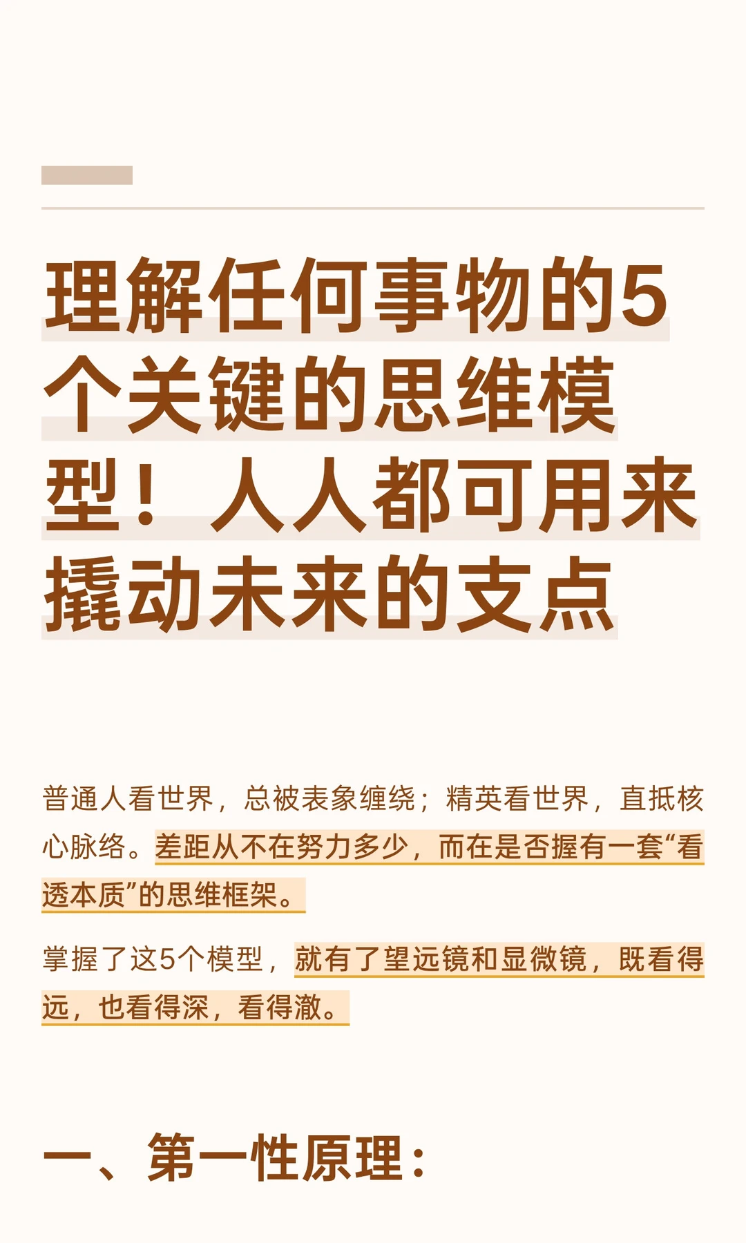 掌握5个思维模型——第一性原理、分解思维、关键驱动因素、二八原理、结构映射和抽象层级,能帮助普通人直抵世界核心脉络,打破认知茧房,高效解构复杂问题,精准聚焦核心,看清全局与细节,重塑理性思考框架。
