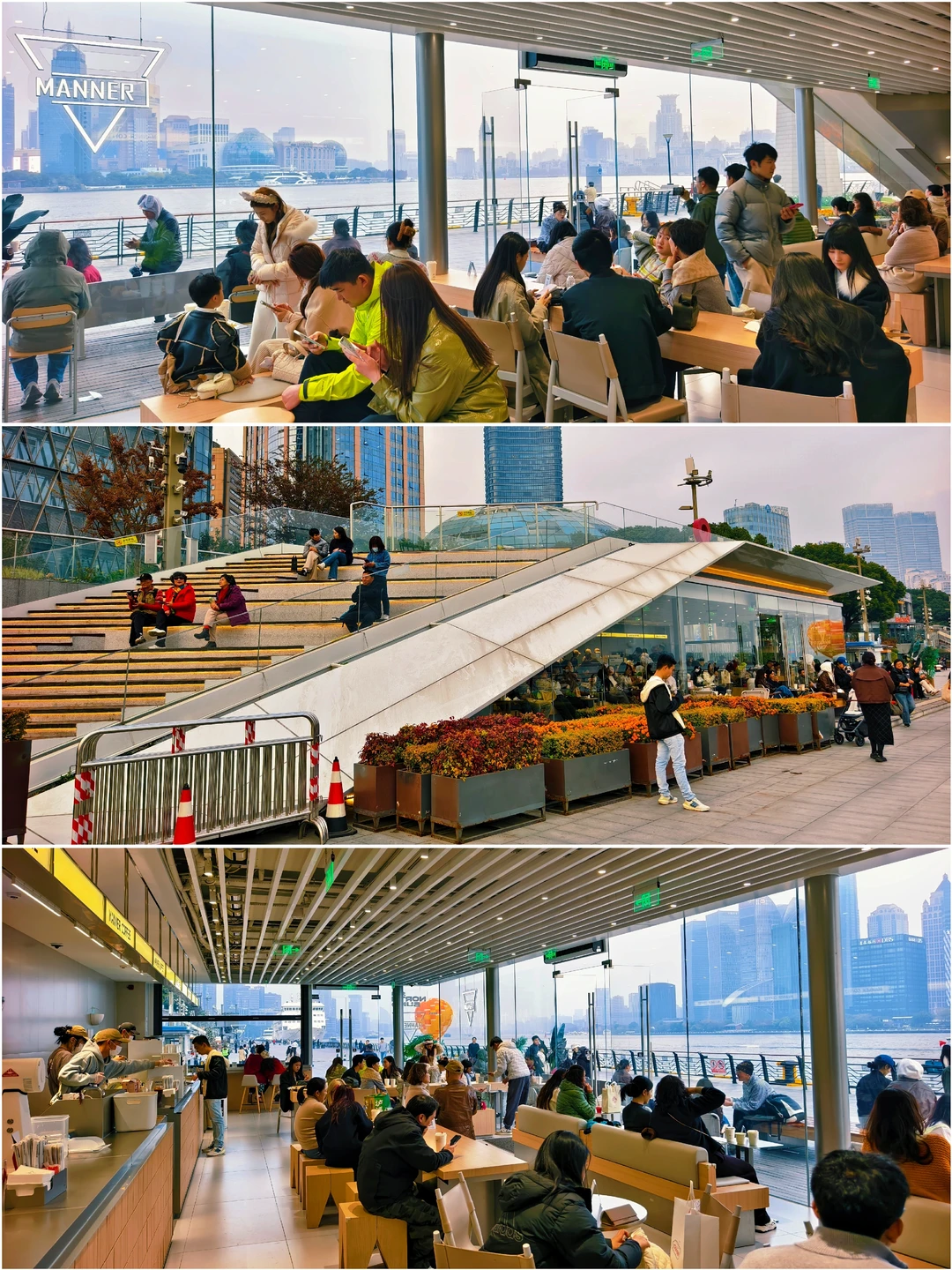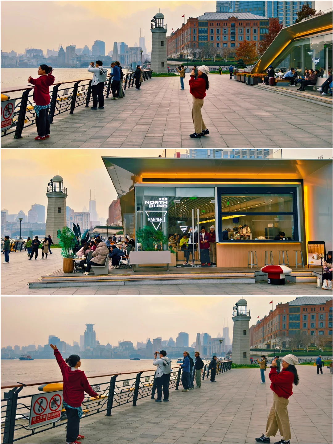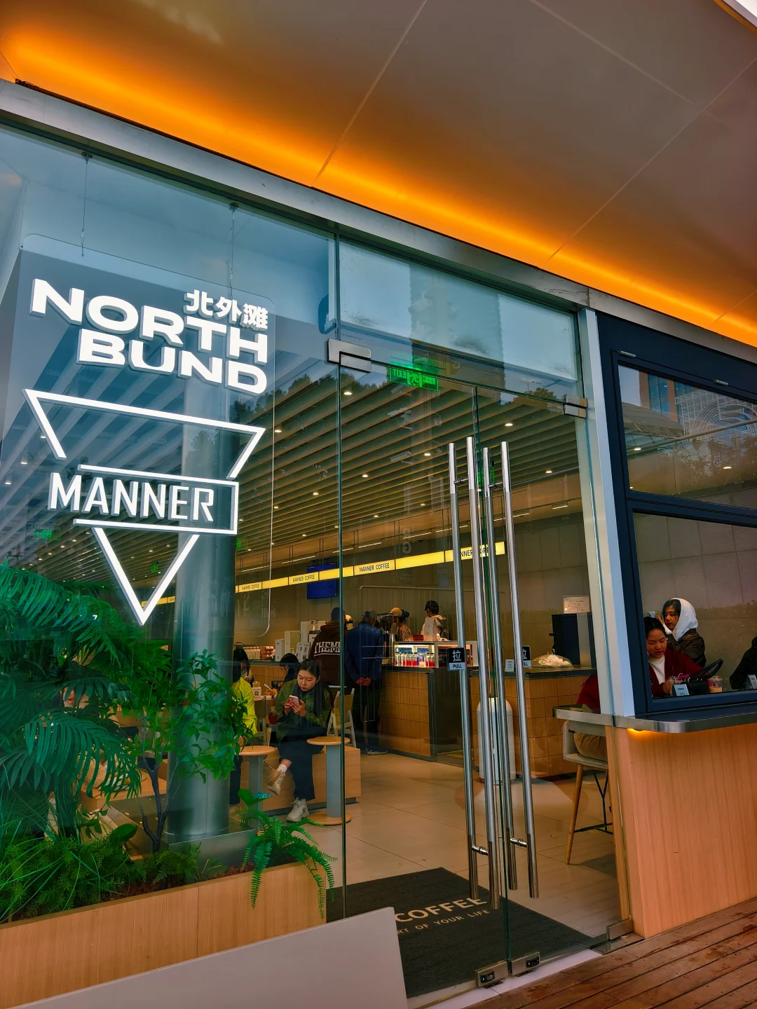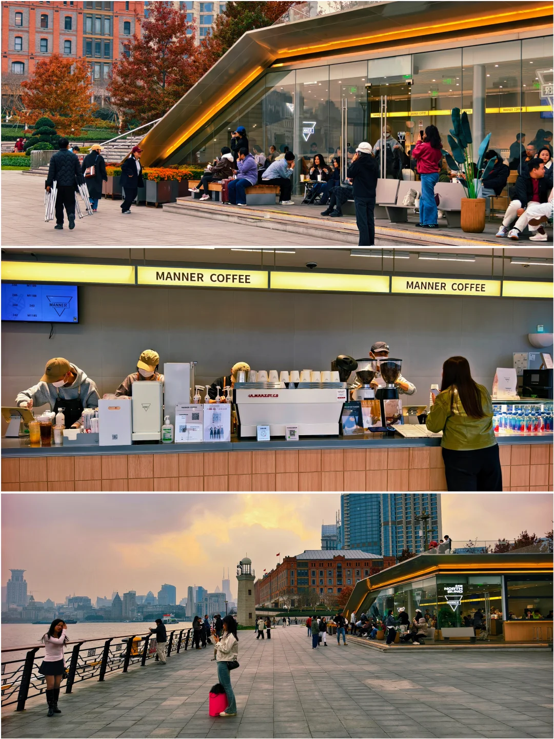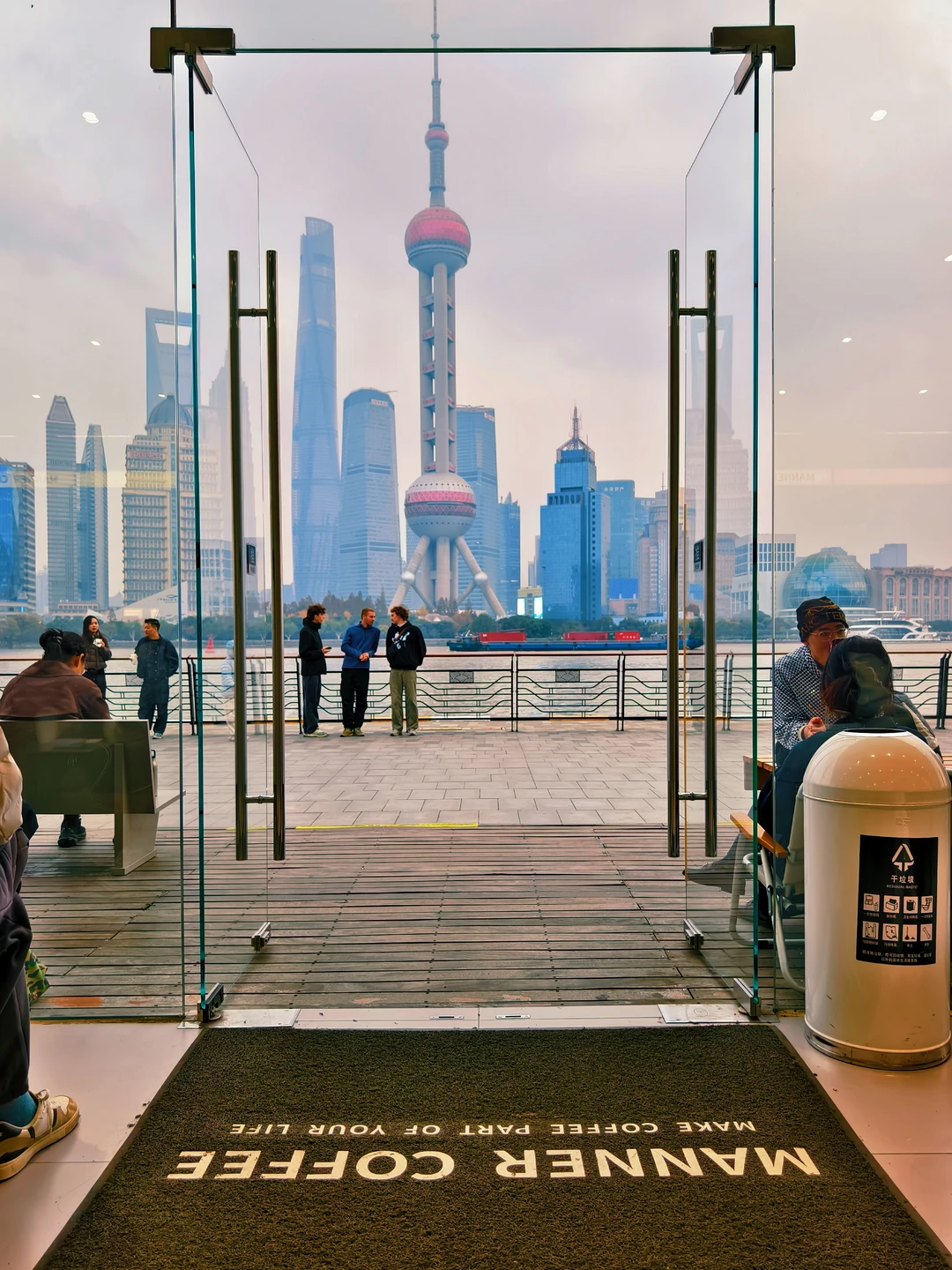 🔥位于北外滩、国客中心码头海事塔区域的Manner Coffee(国客滨江店),是Manner Coffee的第1000家直营店,也是北外滩的网红打卡点 🔥三面落地玻璃设计,坐在店内,你可以毫无遮挡地欣赏黄浦江对岸的“外滩三件套”(上海中心、金茂大厦、环球金融中心)以及东方明珠。 🔥到店的天气不太行,阴天加上海有点雾霾,比蓝天白云的效果差了很多。