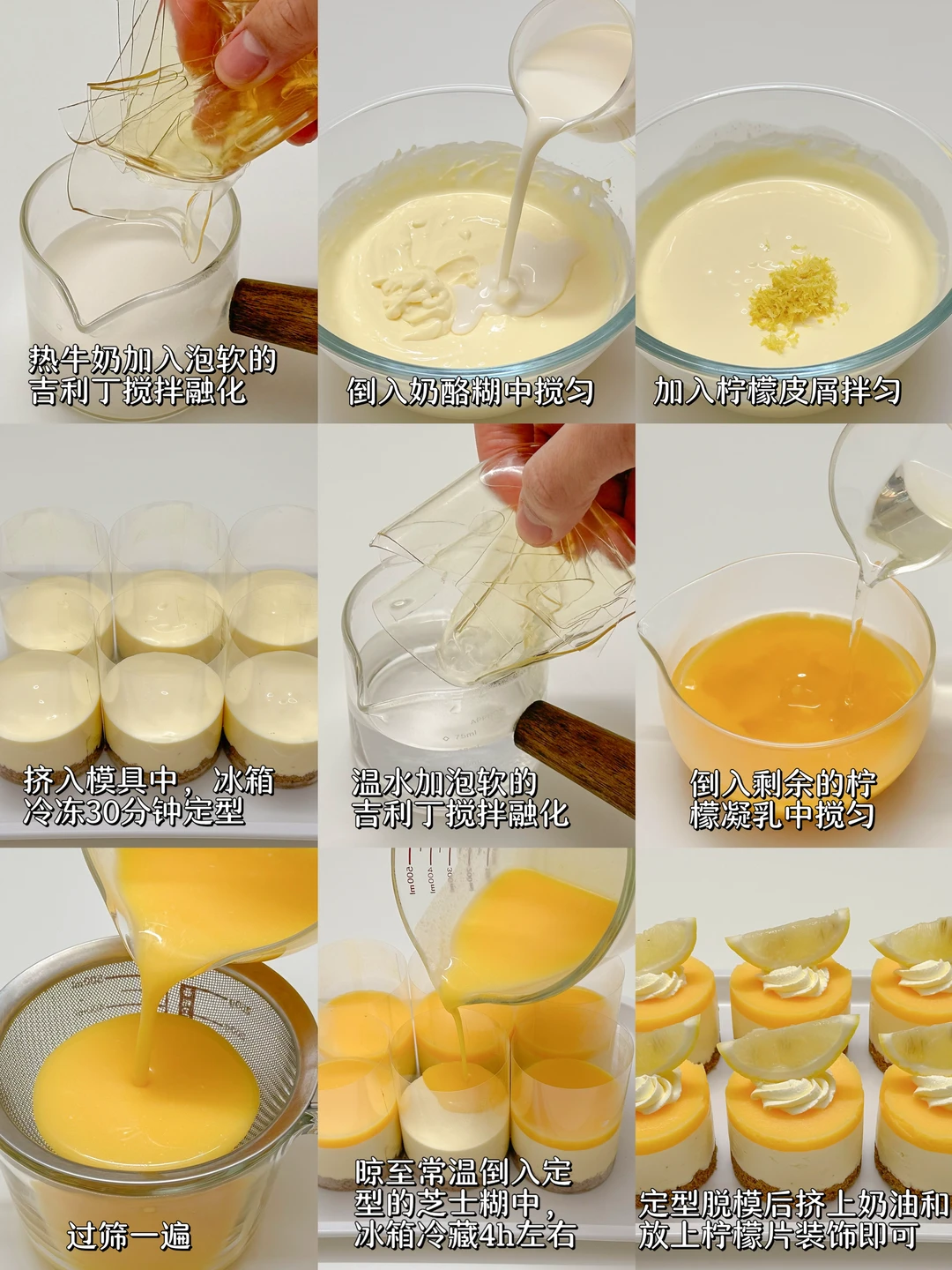 4️⃣温水加泡软的吉利丁搅拌融化,倒入剩余的柠檬凝乳中搅匀,过筛一遍,晾至常温倒入定型的芝士糊中,冰箱冷藏4h左右,定型脱模后挤上奶油和放上柠檬片装饰即可。