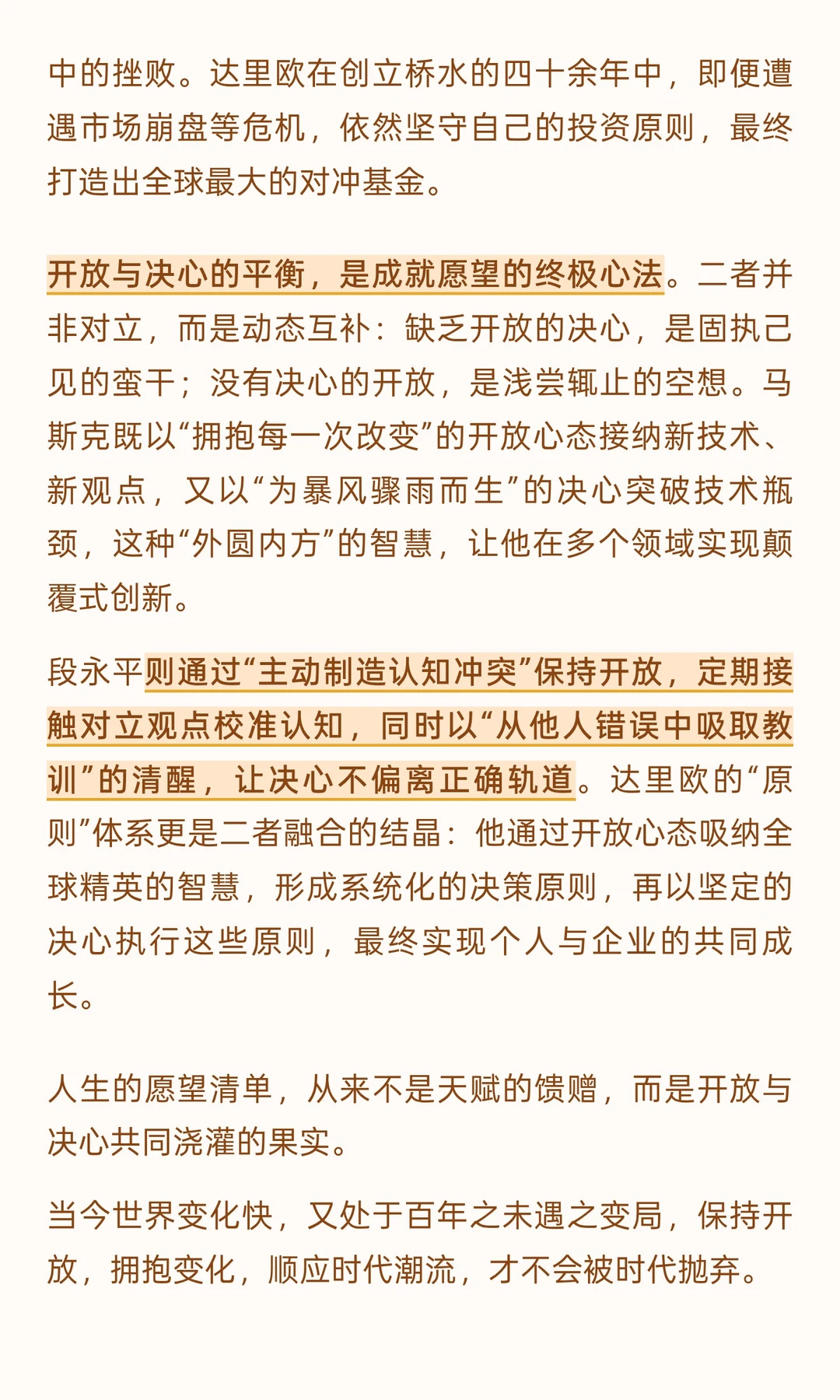 达里欧强调,真正的开放不是“承认自己可能错了”的表面姿态,而是“真诚担忧自己未能以最佳方式判断选择”的深层觉醒,是主动摒弃ego的控制,探索多元视角的能力。