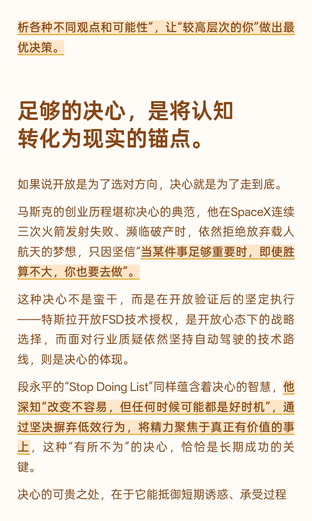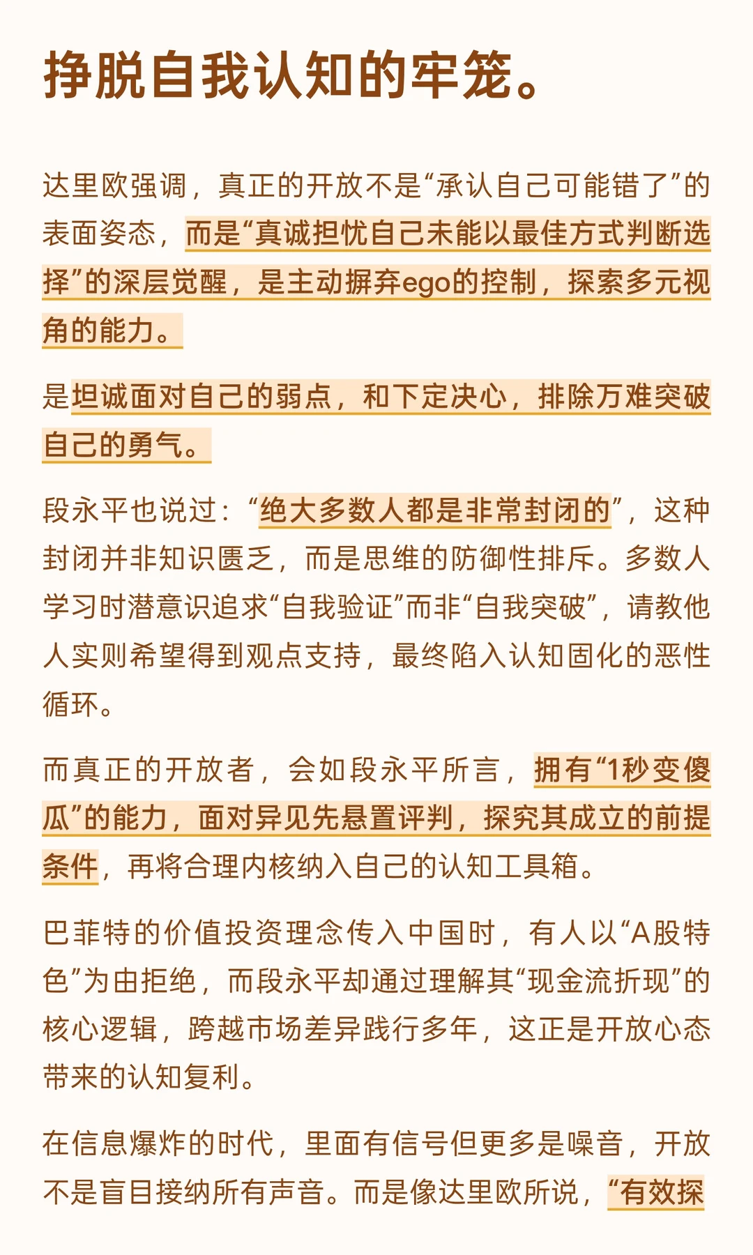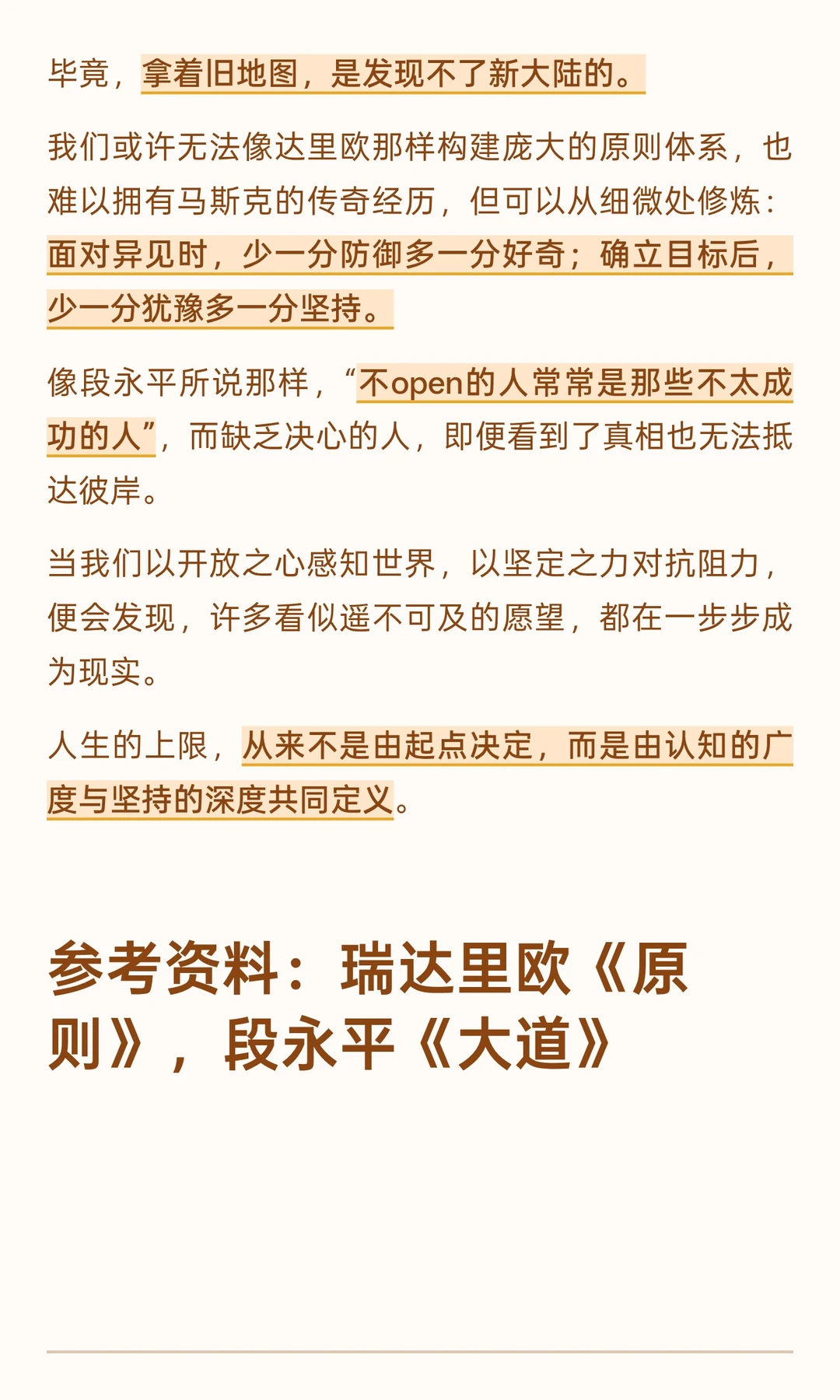 像段永平所说那样,“不open的人常常是那些不太成功的人”,而缺乏决心的人,即便看到了真相也无法抵达彼岸。