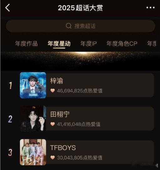 梓渝2025超话大赏第一梓渝田栩宁TFBOYS2025超话大赏TOP3恭喜梓渝2025超话大赏稳居第一,yuni们一出手就知道不简单,大家都好棒,永远给梓渝最好的