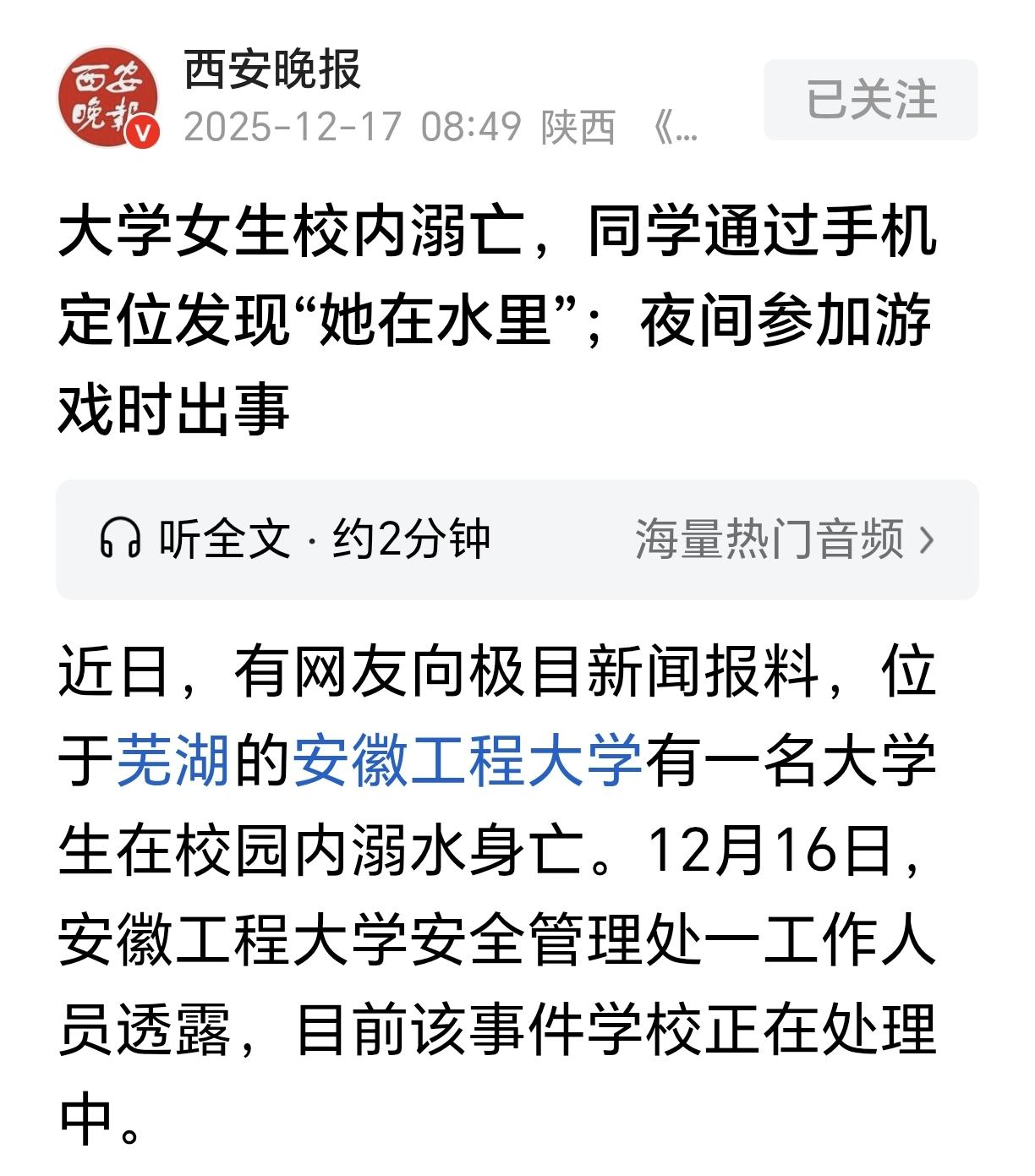 晚上黑灯瞎火地在没有护栏的景观湖边玩“猫捉老鼠”游戏?活动组织者有没有点安全意识啊?安徽工程大学的这位大一女生死得太冤了! 校园的景观湖是学校花力气打造的校园景观,是学生散步的好场所。可却没有安装护栏,照明也不到位,有的地方很黑。白天还行,这一到了夜晚,不熟悉的人在湖边是有坠湖风险的。 12月8日这名来自农村的大一女生就不幸中招了,她在参加同学组织的“猫捉老鼠”游戏时失是坠湖,游戏结束后同学发现她手机定位在湖里,这才发现大事不妙。 校园景观湖不加装护栏还照明不足,明知夜晚湖边不安全还在那里组织“猫捉老鼠”游戏,看来活动的组织者和学校的安全管理都还存在不少问题哩。 现在女生不幸溺亡了,家属是肝肠寸断,事已至此,学校还是要安抚好学生家属,同时也要采取措施加强校园安全管理,消除安全隐患,确保在校师生的平安啊! (网图侵删)