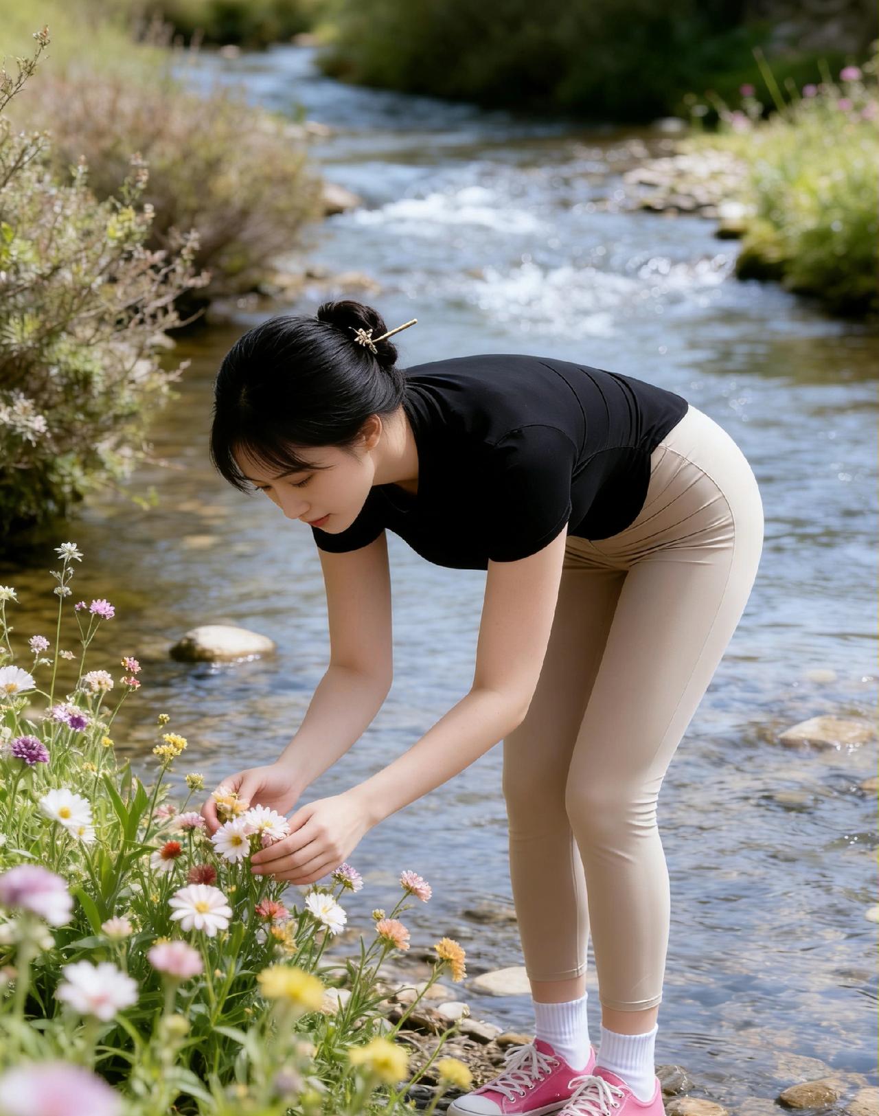 姐姐在溪边美得像幅自然画卷!黑色紧身衣勾勒出曼妙曲线,米色裤装衬得身姿挺拔,低丸子头配发簪,温婉又灵动。蹲在溪边伸手触水,动作轻柔似与自然低语,粉鞋白袜添了活泼感。阳光透过树叶洒下,溪水潺潺、野花簇拥,她与山水相融,优雅中透着恬静,这氛围感直接美到心窝里!美女欣赏图片 性感紧身裤穿搭 紧身裤女神 紧身衣服穿搭 紧身上衣穿搭 灰色紧身上衣 紧身衣照 性感紧身衣美女