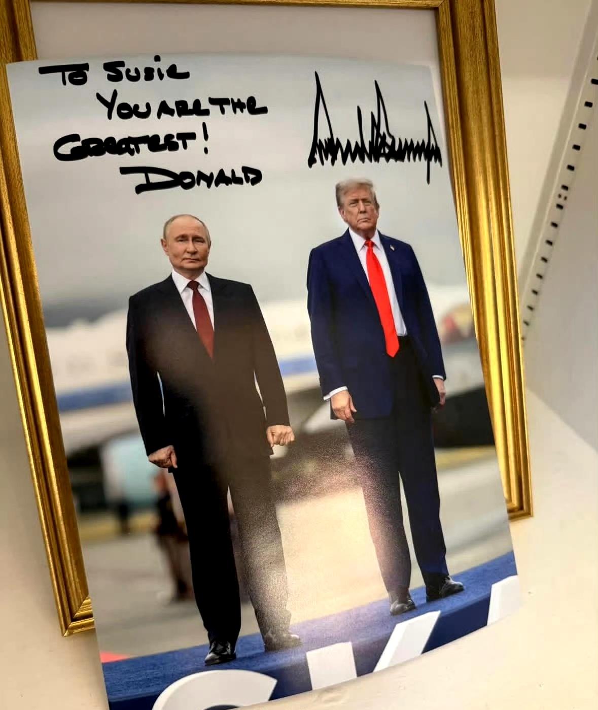 特朗普送给最信任的、白宫幕僚长苏西威尔斯的签名照,是他和普京在阿拉斯加的合照