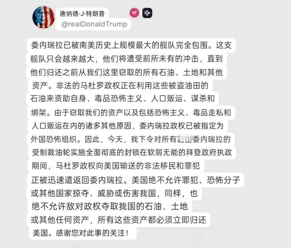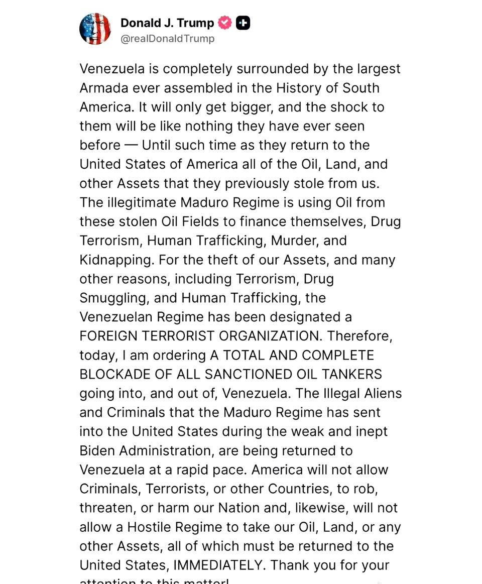 特朗普下令对所有进出委内瑞拉的受制裁油轮实施“全面彻底封锁”。