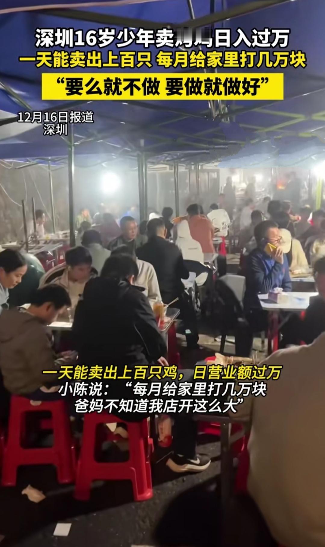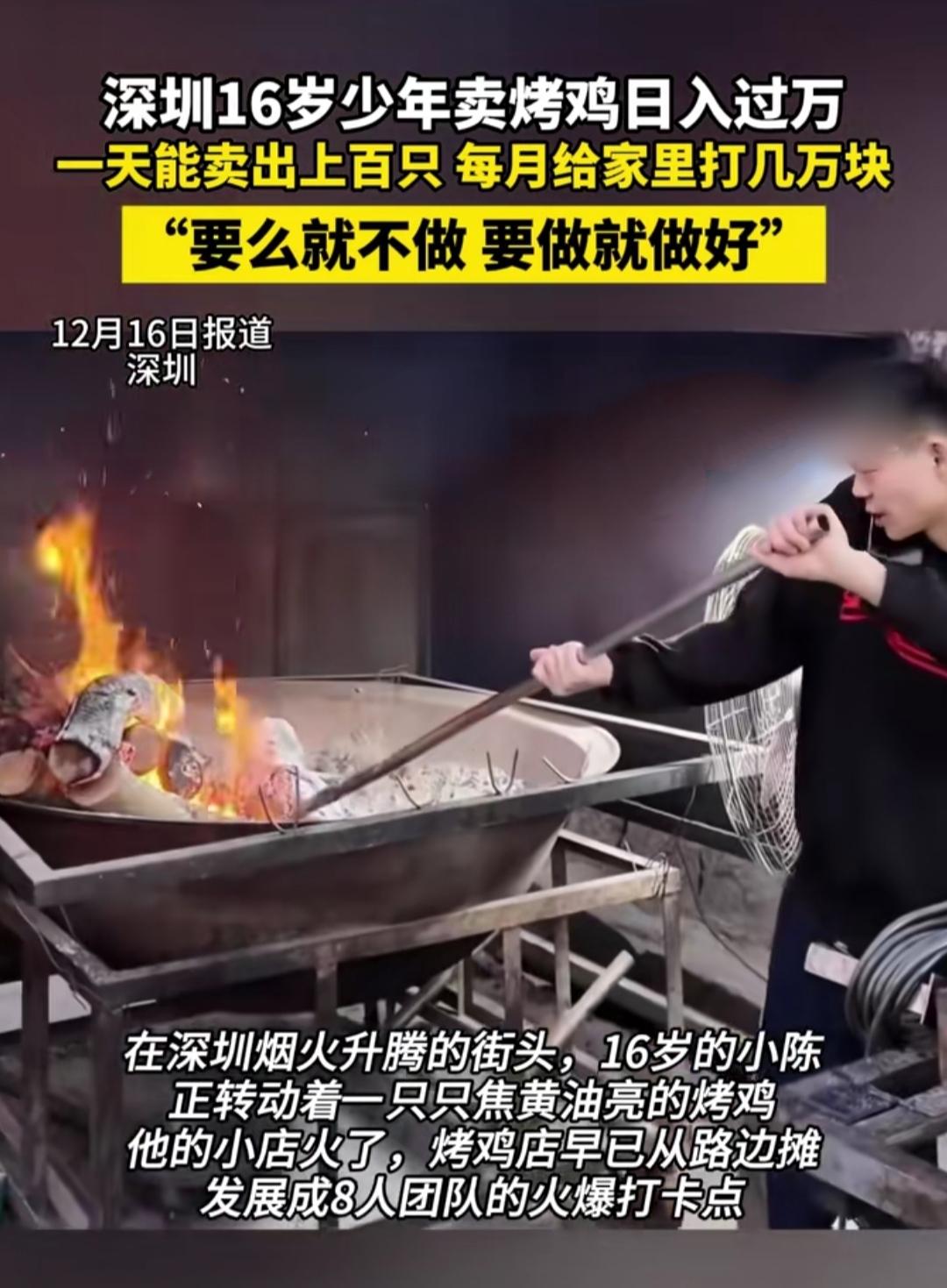 深圳街头的烤炉边,16岁的小陈正忙着翻动烤鸡,火光把他的脸映得通红。没人能想到,这个看起来稚气未脱的少年,已经把烤鸡摊做成了8人团队的网红店,日入过万还每月给家里打几万块,而父母甚至不知道他的店已经开得这么大。 当同龄人还在依赖父母、享受校园时光时,小陈已经在烟火气里摸爬滚打。从推着小推车摆摊的单打独斗,到带着团队分工协作,他靠着“要么不做,要做就做好”的倔劲,反复调试配方、熬夜备货,硬是把烤鸡的香味飘满了街头。 那句“爸妈不知道我店开这么大”,比日入过万的成绩更戳心。少年把生活的苦悄悄咽下,把赚到的甜留给家人,用自己的方式扛起了责任。这不是辍学创业的偶然成功,而是一个少年用努力和担当,在生活里交出的最动人答卷。