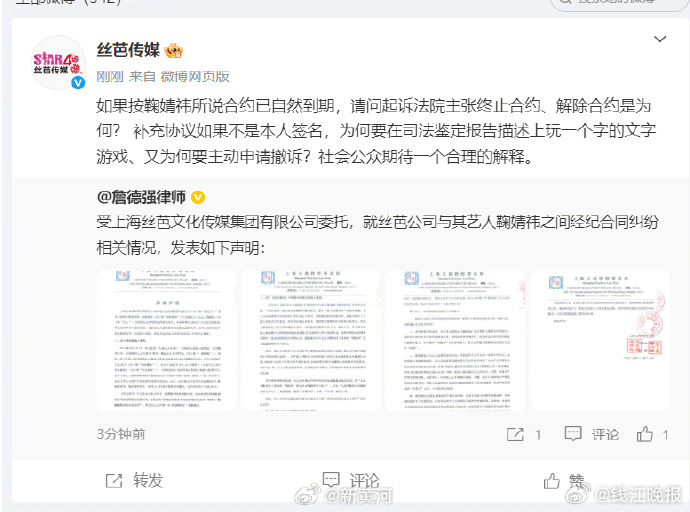 【#丝芭传媒再发文质问鞠婧祎#】17日,再发文质疑鞠婧祎方声明:如果按鞠婧祎所说合约已自然到期,请问起诉法院主张终止合约、解除合约是为何? 补充协议如果不是本人签名,为何要在司法鉴定报告描述上玩一个字的文字游戏、又为何要主动申请撤诉?社会公众期待一个合理的解释。 #丝芭 陪酒#