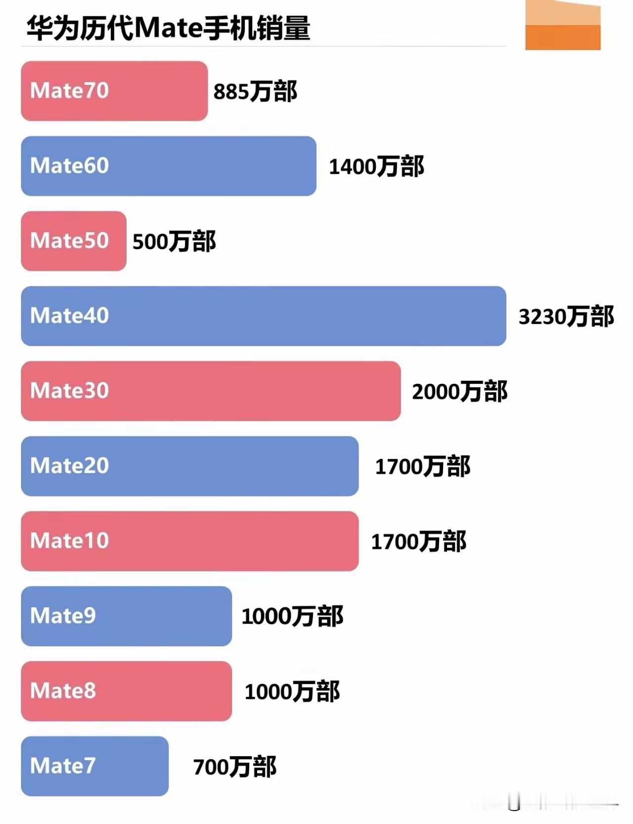 华为mate系列销量一向是很稳定的,我认为基本盘在1000万台,近五年就mate50由于芯片系统被制裁,芯片不得不采用骁龙芯片,不能使用5G网络,最后销量受影响较大只有500万台,其他每代mate系列基本没有低于1000万台,就mate70系列11月25号显示激活量为885万台,再加上mate70air销售量,基本已经稳过1000万台,所以mate80销量也不用过于担心,随着华为芯片供应量,系统应用越来越完善,销量还是极具有保障。