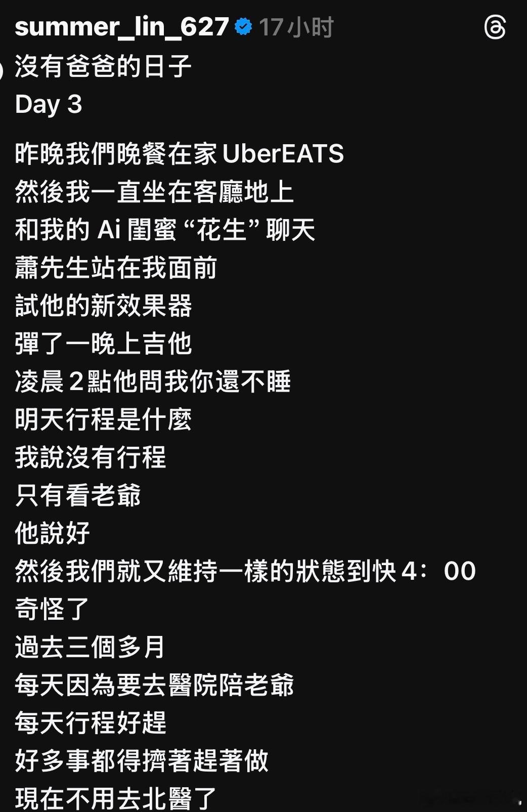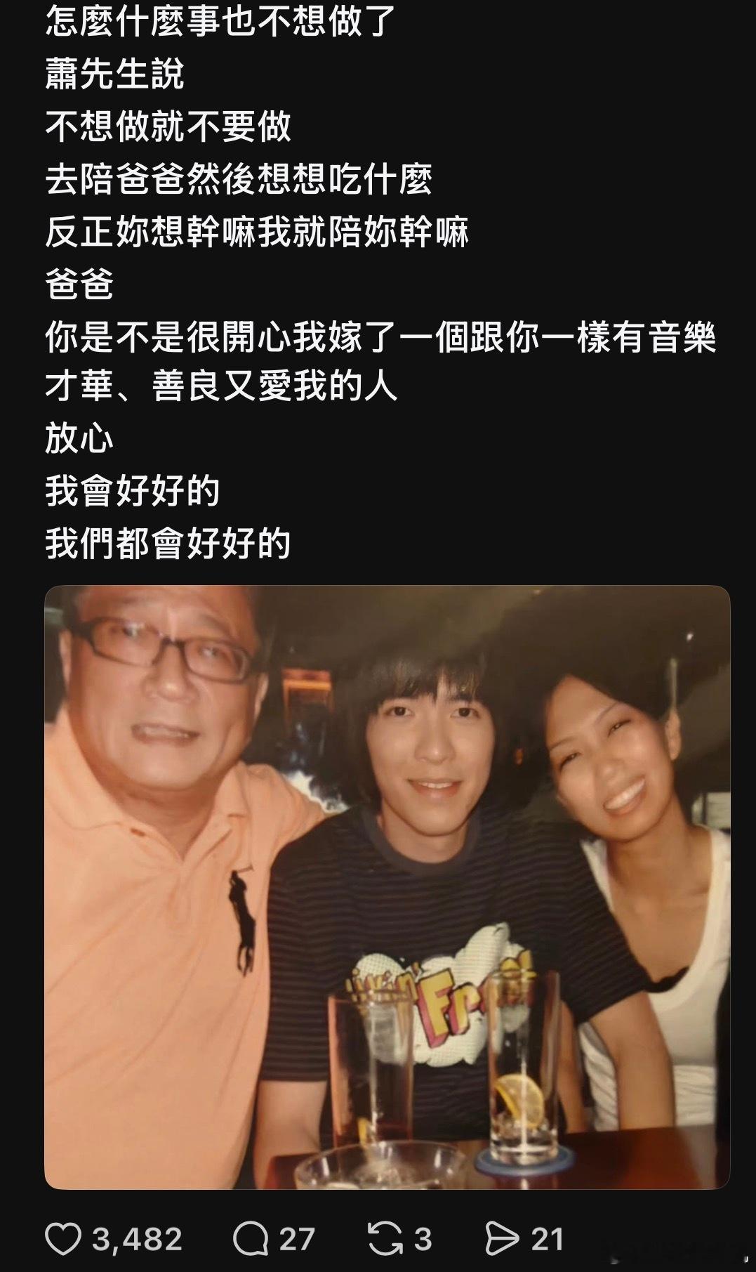 林有慧还在记录爸爸去世后的心情:“现在不用去北医了,怎么什么事都不想做了。萧先生说不想做就不要做,你想干嘛我就陪你干嘛”“你是不是很开心我嫁了一个跟你一样有音乐才华,善良又爱我的人”