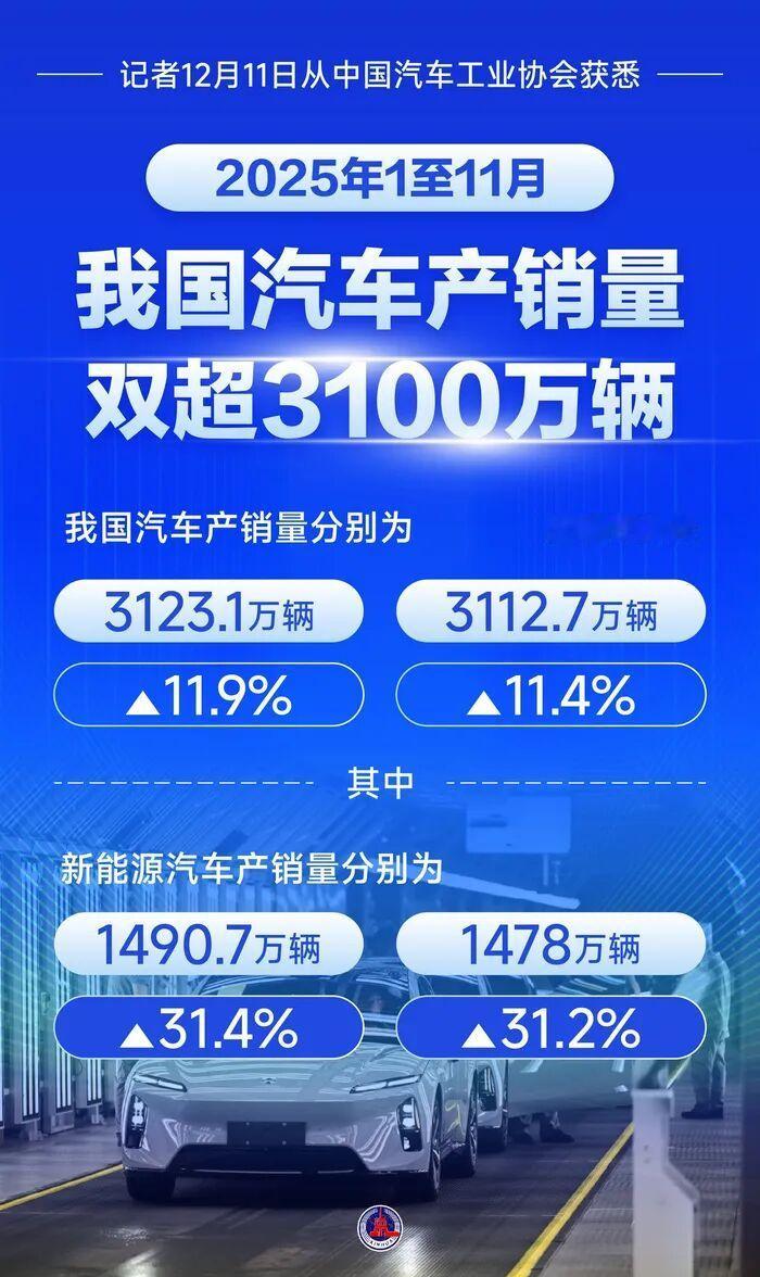 1—11月,新能源汽车产销分别完成1490.7万辆和1478.0万辆,同比分别增长31.4%和31.2%,新能源汽车新车销量达到汽车新车总销量的47.5%。