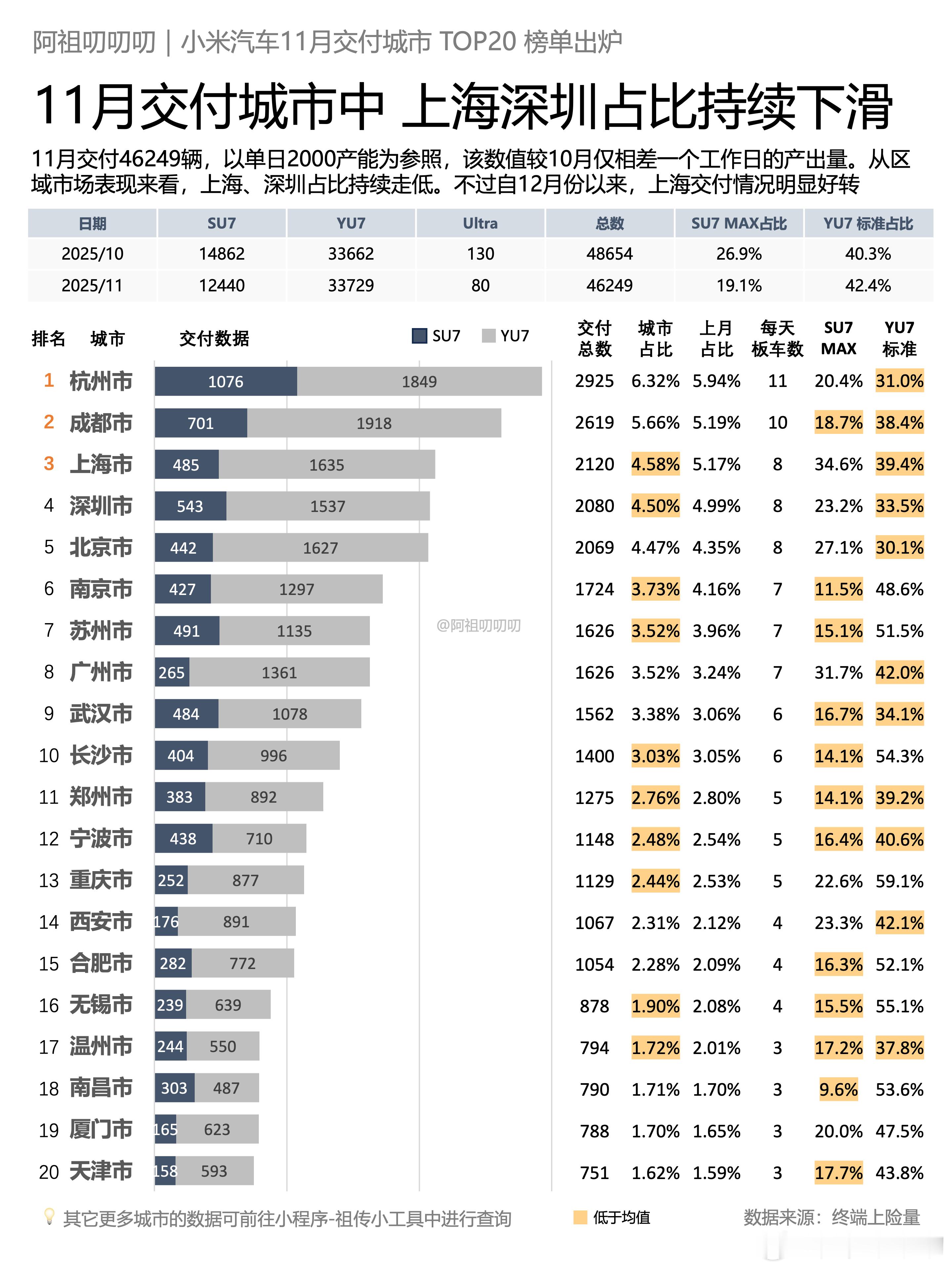 小米汽车 11月交付城市 TOP20 榜单出炉,上海深圳果然不给力呀11月交付46249辆,以单日2000产能为参照,该数值较10月仅相差一个工作日的产出量。从区域市场表现来看,上海、深圳占比持续走低。不过自12月份以来,上海交付情况明显好转,月初去交付中心能明显感受到一波又一波的下线。欢迎上海的车友们加入毕业班车友群啦