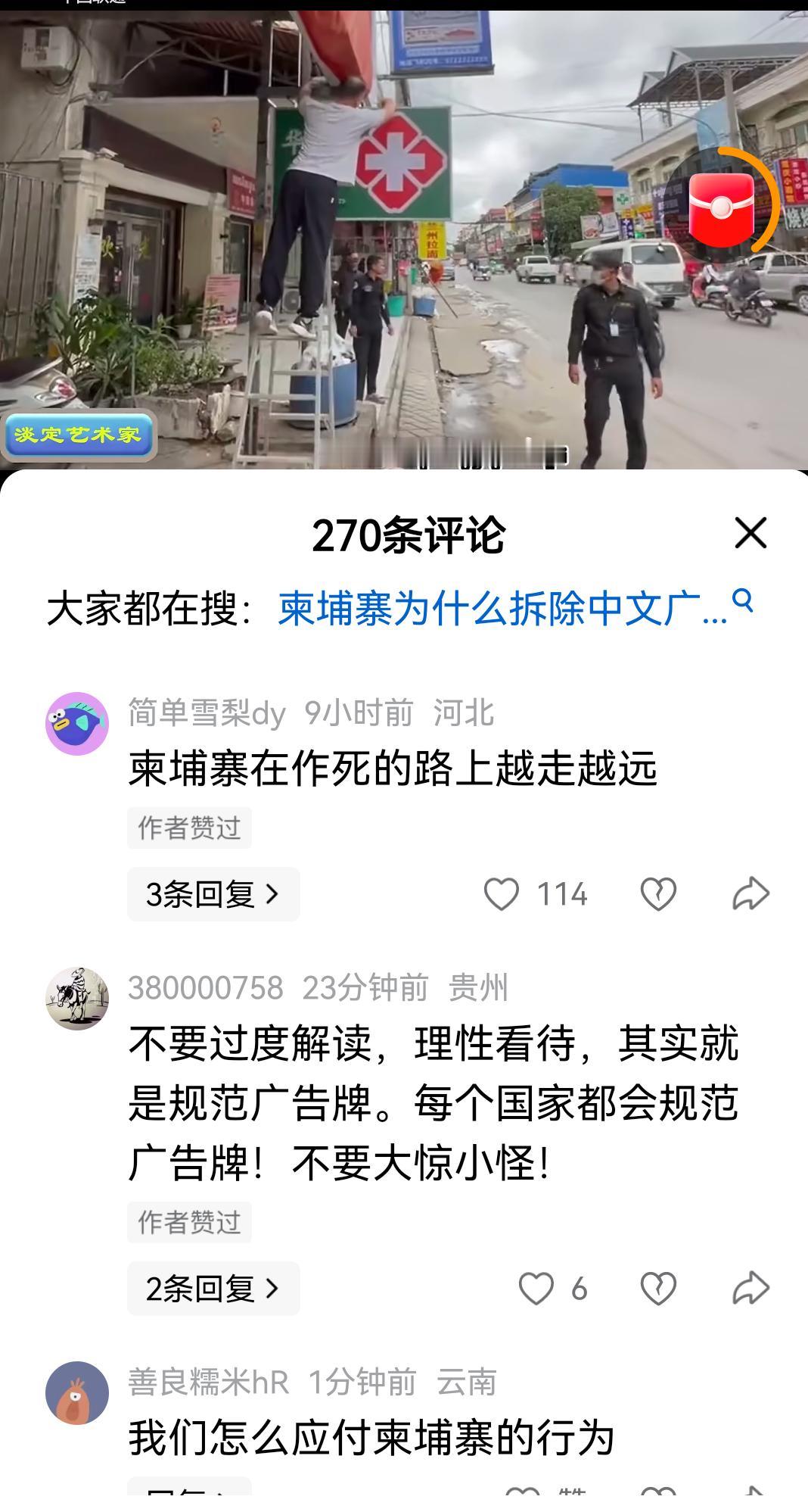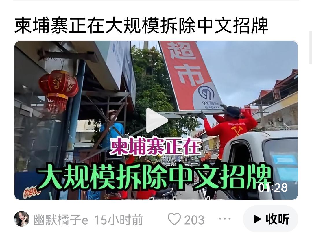 柬埔寨拆除中文招牌,引起网友激烈热议! 中国与柬埔寨是传统友好邻邦,两国关系在相互尊重、平等互利的基础上持续健康发展。中柬两国在基础设施、经贸投资、人文交流等领域的合作成果丰硕,为两国人民带来了实实在在的利益。中国也会继续与柬埔寨一道,共同维护地区和平稳定,促进共同发展繁荣。 柬埔寨作为一个主权国家,拆除个广告牌没有什么大惊小怪的。不要过度解读,误导两国民众情绪,做那些让亲者痛仇者快的事情。