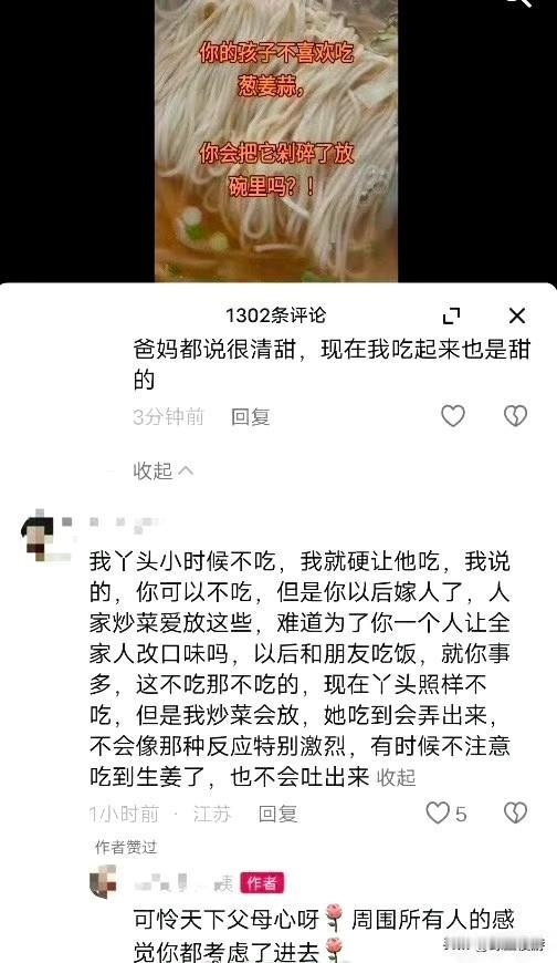 妈妈说:你以后嫁人了,人家不会为了你炒菜不放葱姜蒜的。 所以在结婚之前,我妈妈做饭菜从来不考虑我的感受,每次硬让我吃这些葱姜蒜我都会恶心难受🤢! 而在我结婚之后,我婆家他们反而都很考虑我的感受,都比较迁就我,每次做饭我老公和公公婆婆他们都是单独放葱蒜,如果做包子饺子啥的,都会单独做一些不带葱姜蒜的给我吃,他们另做一些他们爱吃的口味!
