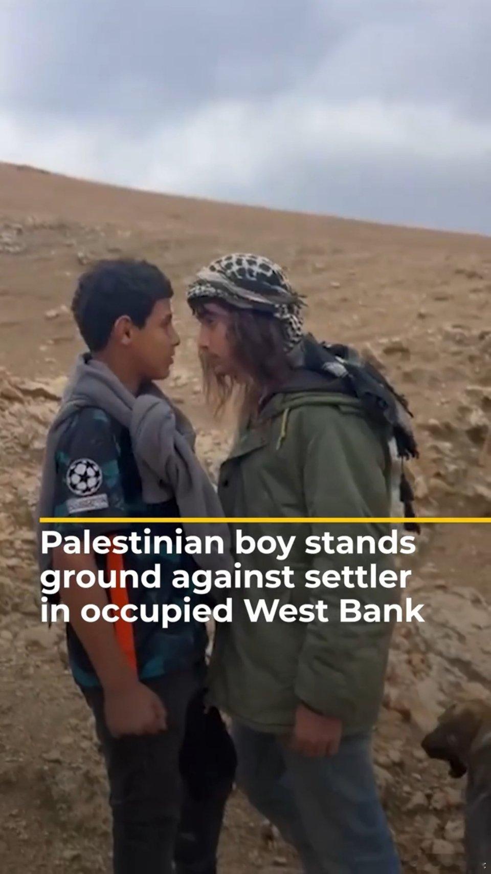 寰球镜头巴以冲突 以色列青少年还这么小就已经表现出了如此大的侵略性。难怪犹太人这么不让人喜欢。在国外千万不能离这群人太近,太多被他们迫害的人想报复他们了。在被以色列占领的巴勒斯坦约旦河西岸,一名巴勒斯坦男孩在自己的土地上与一名以色列青少年定居者面对面站立。海外新鲜事