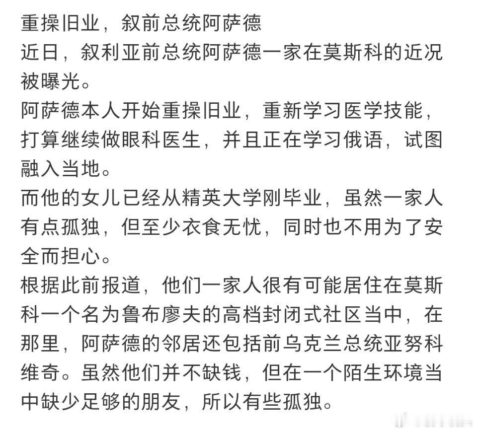 叙前总统阿萨德一家在莫斯科近况曝光这样挺好的,阿萨德再也不用为叙利亚的事操心了,在俄罗斯安心当个富家翁就好。海外新鲜事
