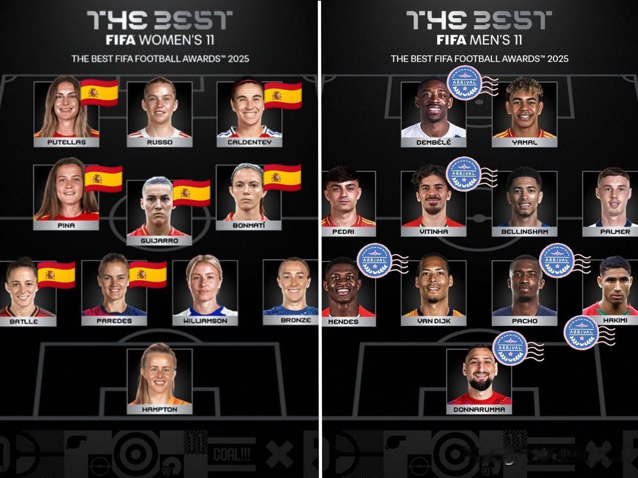 看到男女足最佳阵容...震惊! 西班牙女足,11个占7个。 大巴黎男足,11个占6个。 女足方面,无论是国籍还是所效力俱乐部,最佳阵容中的球员都比较集中:被西班牙籍(7人)和英格兰籍(4人)瓜分,且只分布在三家俱乐部:巴萨罗那6人、阿森纳3人、切尔西2人。 男足方面,最佳阵容中的球员所效力俱乐部集中于大巴黎(6人),巴萨2人位居其次,皇马、利物浦、切尔西各1人,而球员的国籍比较分散:11人来自于8个国家,只有西班牙、英格兰、葡萄牙分别有2人入选。