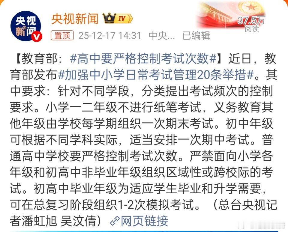 说实在的,现在的学生比我们当初累多了,从小学生都这样,每天上完课,放学回家各种打卡,阅读、跳绳、仰卧起坐,还都要拍视频上传。周末各种兴趣班。家长累、学生更累。要我说,学校每天三四点就放学是真不合理,虽然学校也有托管班,但一般都是一个小时。家长都在上班,如果家里每个老人帮忙,接娃是一点没有办法。就只能报外面的托管班。真的是很难。高中要严格控制考试次数的相关内容,来智搜看看。热点观点 高中要严格控制考试次数