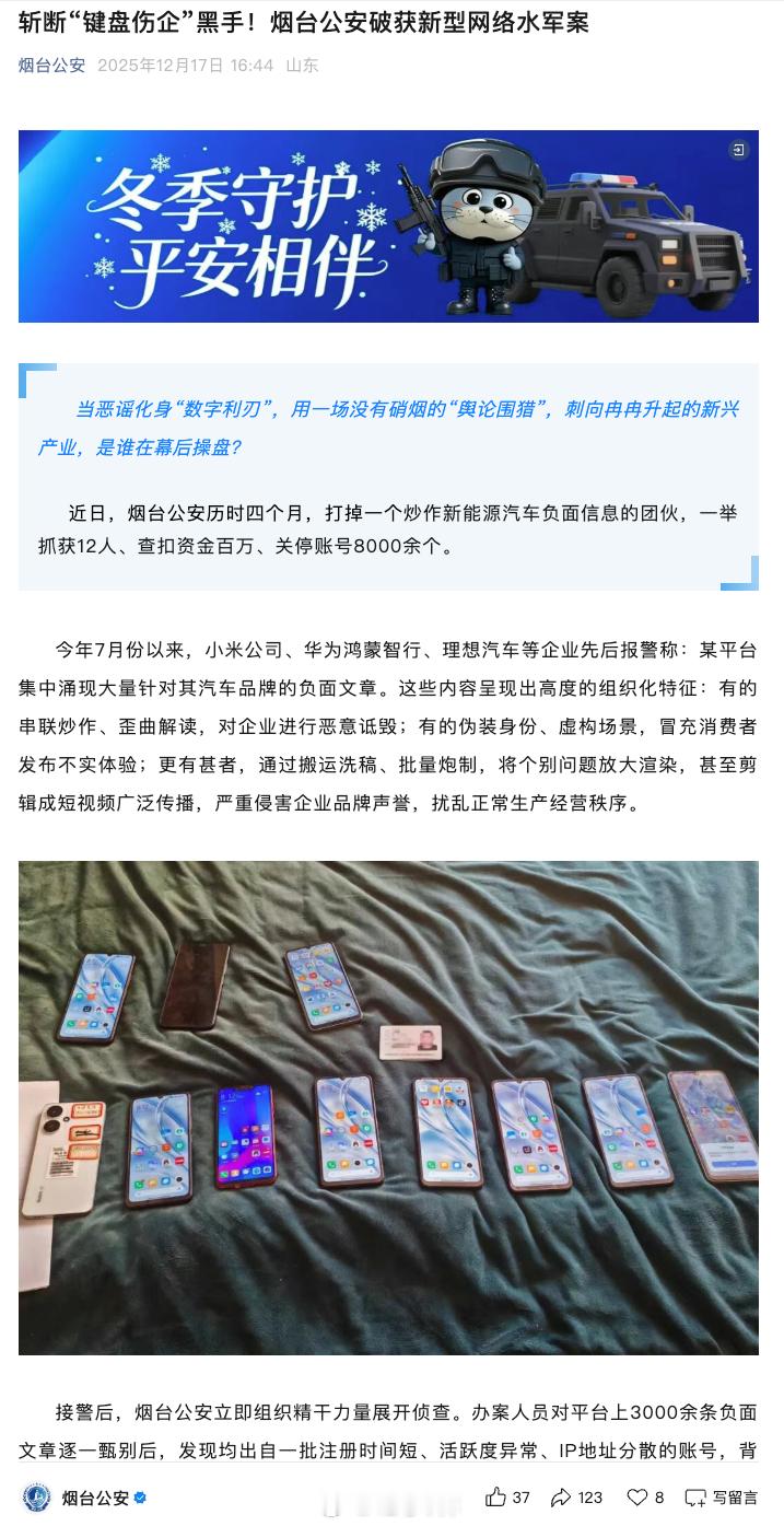 小米、华为、理想先后报警之后,烟台公安历时四个月破获了一起网络水军案。这个团伙用 AI 批量生成内容,做了八千多个违法账号,目的只是为了赚取平台的流量收益。随着 AI 工具的发展,黑水军作案效率都变高了……42how新能源汽车