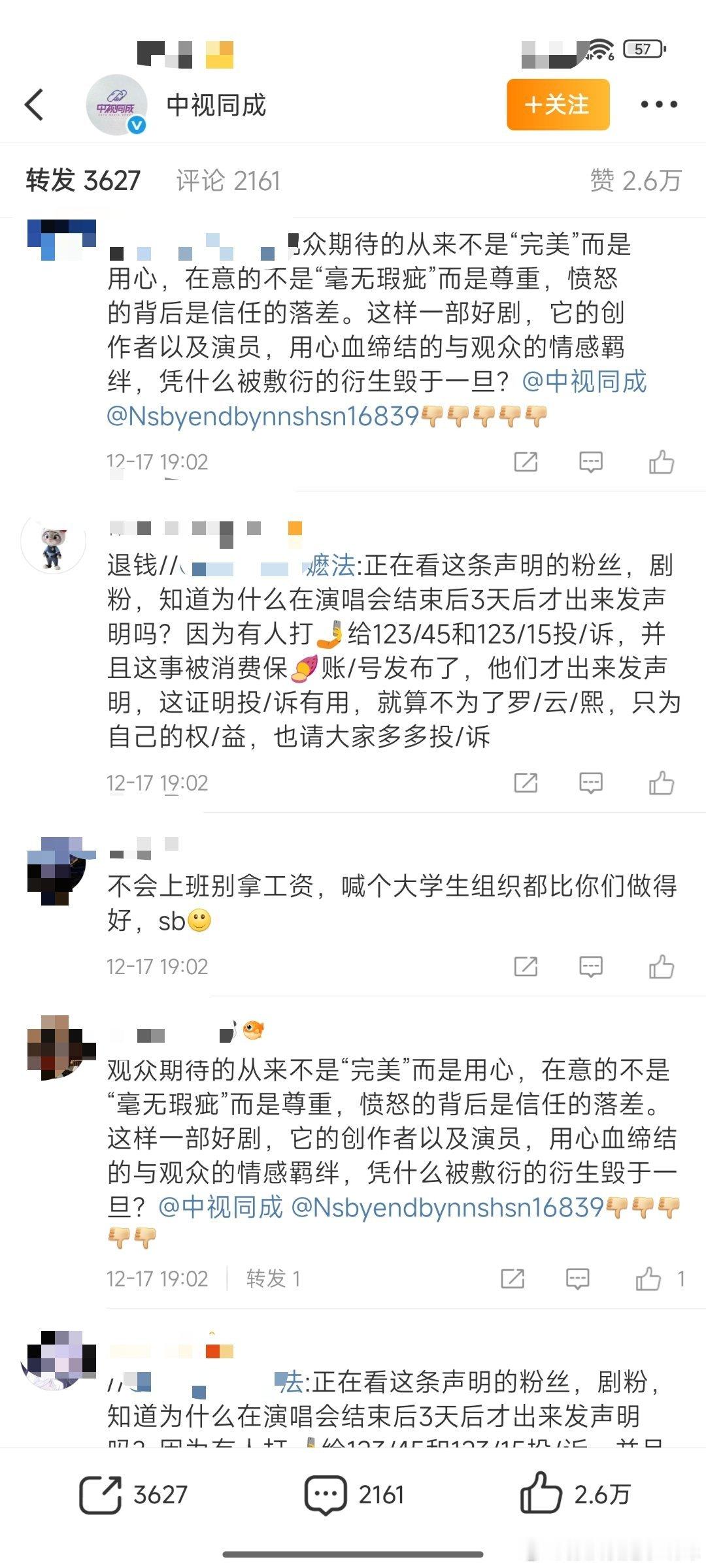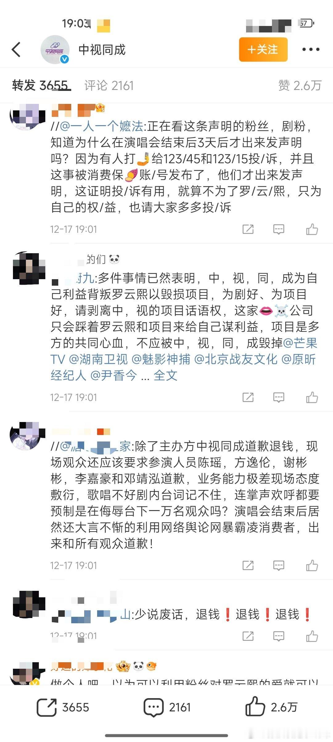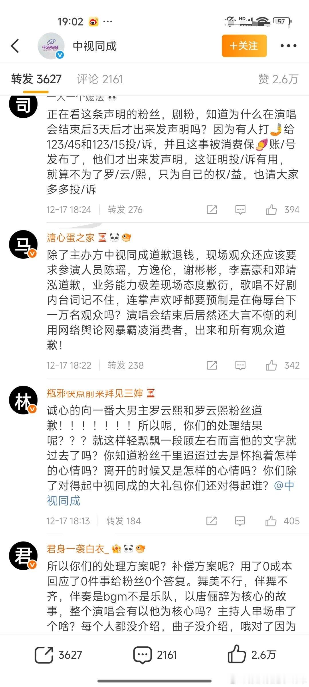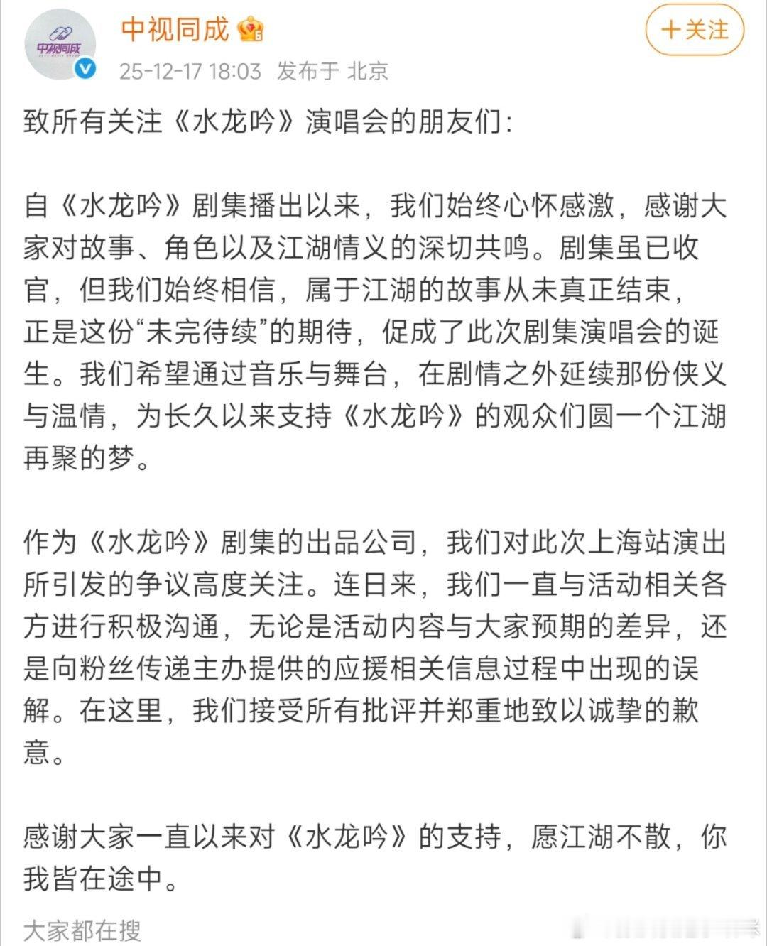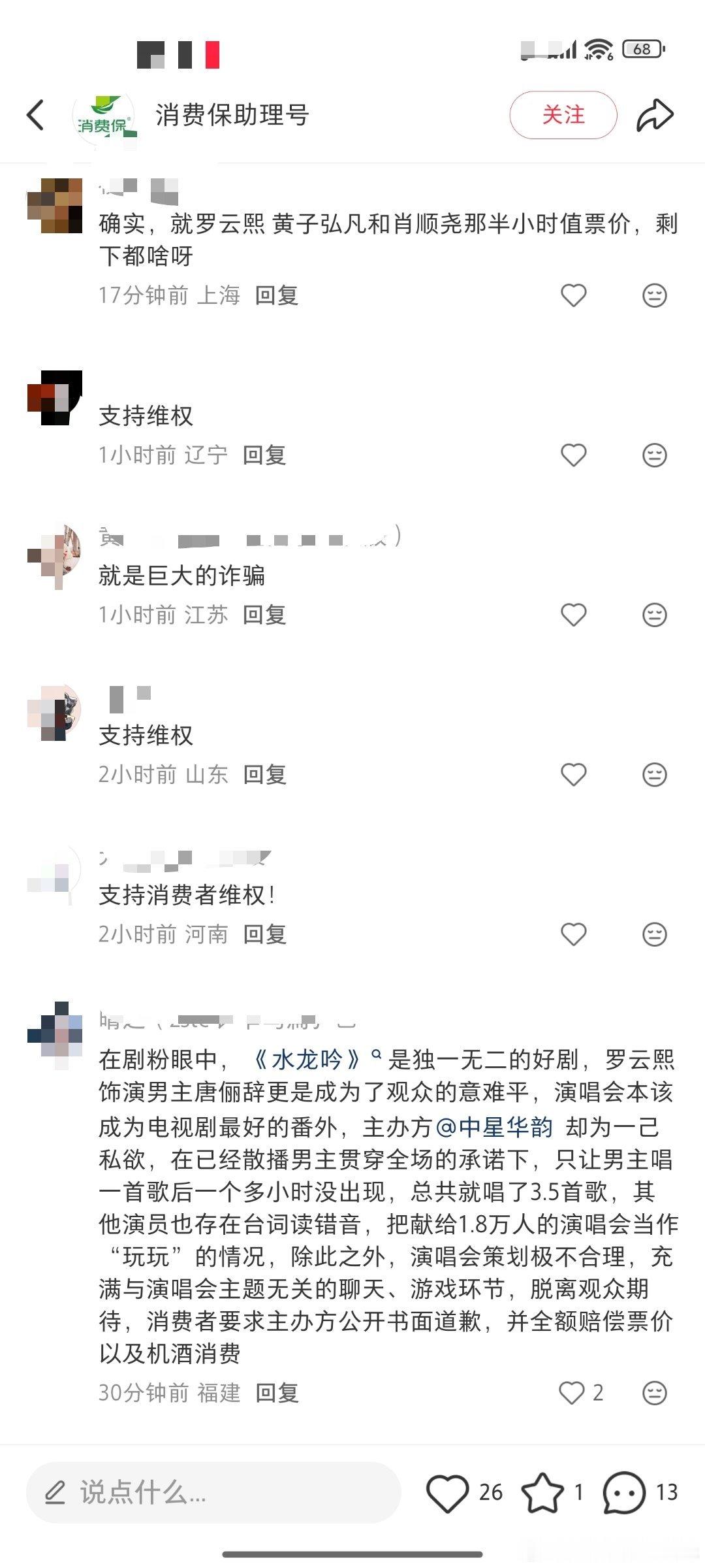 罗云熙粉丝维权水龙吟演唱会 《水龙吟》演唱会结束后,喜提部分罗云熙粉丝排字维权。说好的“主角贯穿全场”,结果罗云熙只唱3.5首;说好的“续写剧情”,过半歌曲竟与剧无关。非常神奇的是《水龙吟》演唱会,罗云熙竟然唱了一首《天下》,这首歌一想起,脑子里出现的是《水龙吟》吗??非常蜜汁操作,实在不行让罗云熙唱他男团时候的歌都行吧?粉丝更是质疑“预制菜”式演出——流程混乱、舞美粗糙,连欢呼声都被曝是提前录制!场外粉丝痛哭,场内齐喊“退钱”。这场被骂上热搜的《水龙吟》演唱会,彻底撕开“情怀变现”的遮羞布。而这把火,早就烧到了剧集本身。粉丝苦大男主罗云熙“戏份不足、宣发失踪”久矣:从2024年起就呼吁男主“95%戏份占比”,直言“罗云熙出场率就是热度晴雨表”。可官抖粉丝不到10万、热搜屈指可数,对比同期剧集推流正常,资方被指“只想收割、不想耕耘”。风波发酵后,出品方中视同成终于致歉,称是“预期差异”“信息误解”。但轻飘飘的声明,如何接得住粉丝沉甸甸的期待?你们晓得我的一贯风格的,粉丝闹事我很少站粉丝的,但是这一次,确实是欠教育了