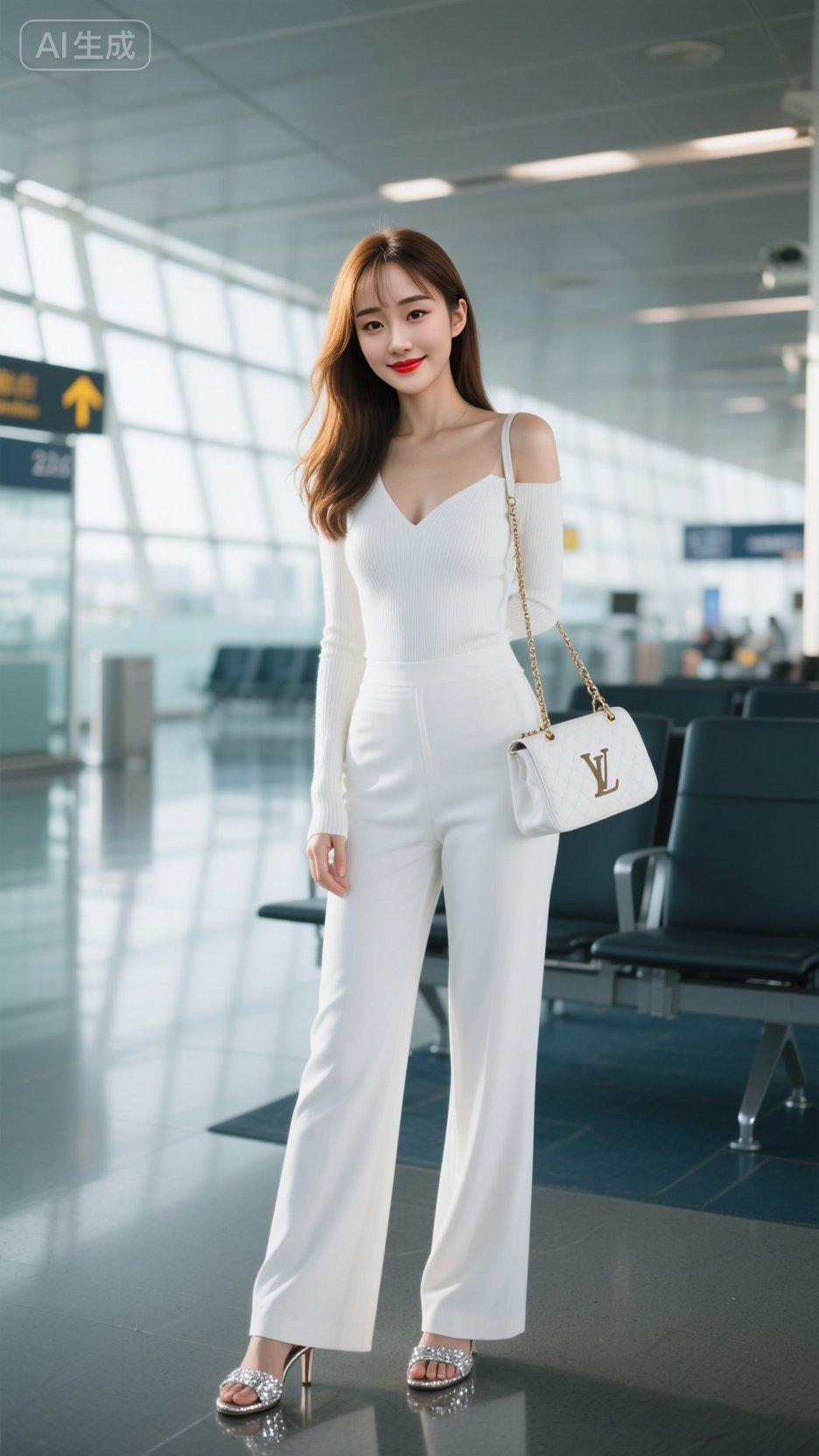 一位20岁可爱女孩,黄棕色长发,空气刘海,妆容精致,站立在飞机场候机大厅内