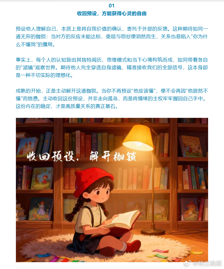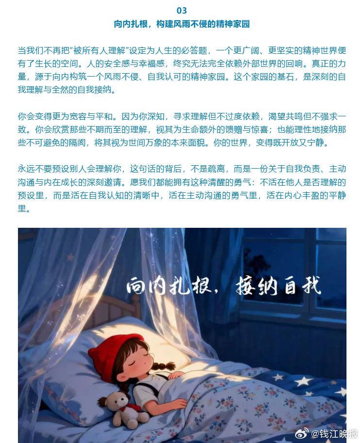 【夜读丨#不要预设别人会先理解你#】在人际交往中,“被理解”常被视为一种情感刚需。我们习惯性地预设:爱我们的人理应懂得我们的弦外之音,共事的伙伴应当领会我们的未尽之意,亲密关系更需达到不言而喻的默契。然而,正是这种预设,往往成为失望、隔阂与内心消耗的源头。与其将情绪的钥匙交予他人,等待一场未必会来的“理解”,不如收回目光,专注于构建内在的完整与从容——这不是对人际关系的悲观,而是一种清醒的智慧与成熟的力量。(新华社)