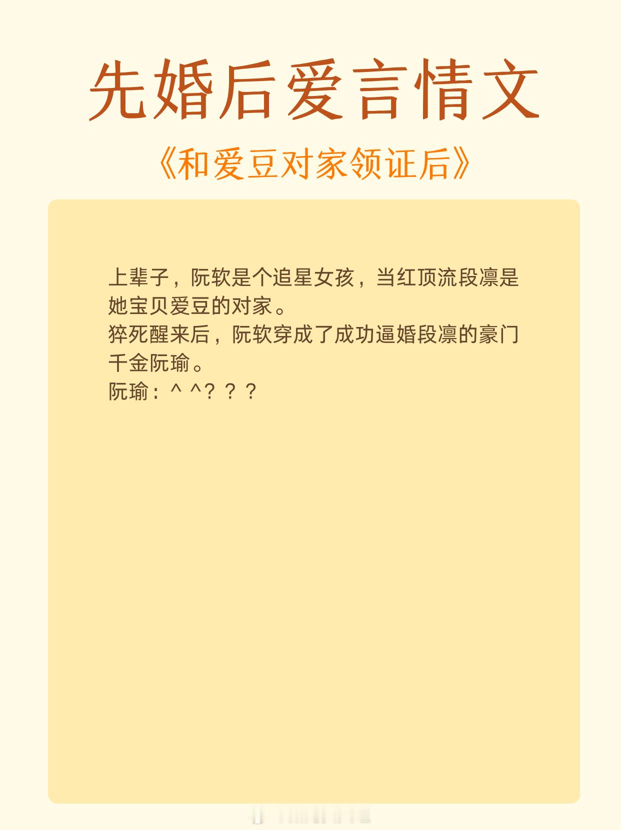 天花板级的先婚后爱言情文,扭转所有所有的不可能。1、《恃宠》作者:臣年2、《错嫁给年代文大佬后》作者:柠檬九3、《暗室婚书[先婚后爱]》作者:慕义4、《备忘录被同步到他手机上后》作者:岁岁无恙5、《替嫁以后》作者:溪畔茶6、《我与太子举案齐眉》作者:令杳7、《和爱豆对家领证后》作者:瓷话8、《京晚初雪》作者:妩梵9、《晨昏界限》作者:时星草网文界的诸神之战 这小说写在我心趴上了