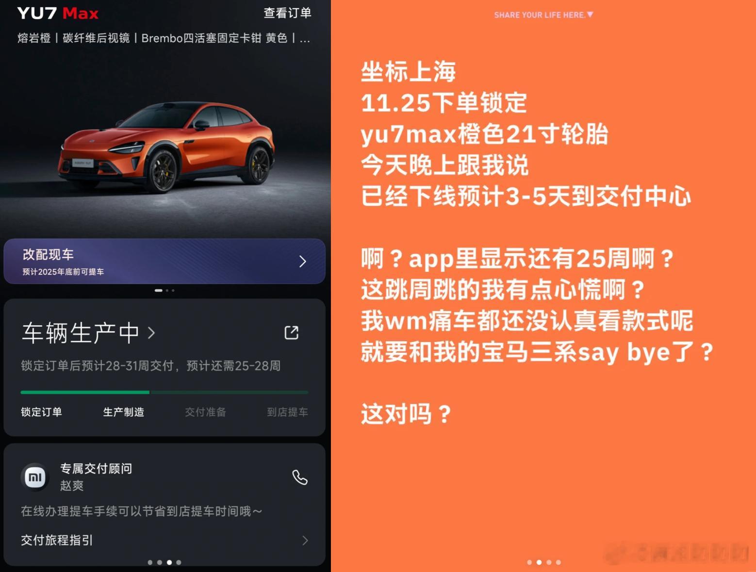 11.25锁单的YU7 MAX也正常下线了,刷到的这位车主还是上海的,wmls🥕上大分。已知YU7 MAX的配置组合有27648种,冷门配置大力出奇迹小米yu7