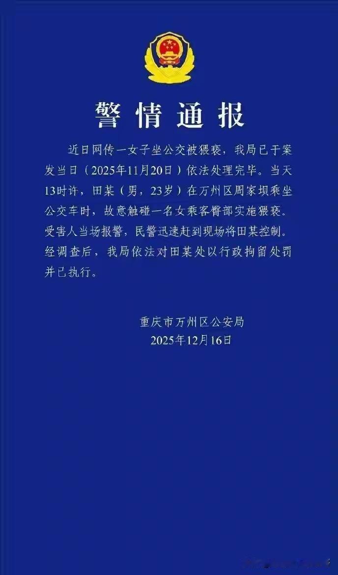 我不敢相信这种事情竟然发生出来,在重庆,在公交车上一名23岁的年轻男子摸一个女生的臀部实施猥亵行为,但是全车都没有人吭声,司机也像乌龟一样坐在一旁,后来这个女生无奈自己报警,我终于可以理解为什么现在很多人对这个社会感到特别的冷漠和冷血,我记得以前有一个漂亮的女司机,当时她被流氓实施性侵的时候,没有一个人上前帮忙,最后再回来之后她开了这辆公交车直接投进了江河中,所有人全部遇难!我只是希望今天的是他人,明天可能就是自己,所以说大家在遇到困难的时候啊,尤其是危机时刻的时候,真的能够有人能有人能够勇敢的站出来帮别人一把,也可能是帮自己!