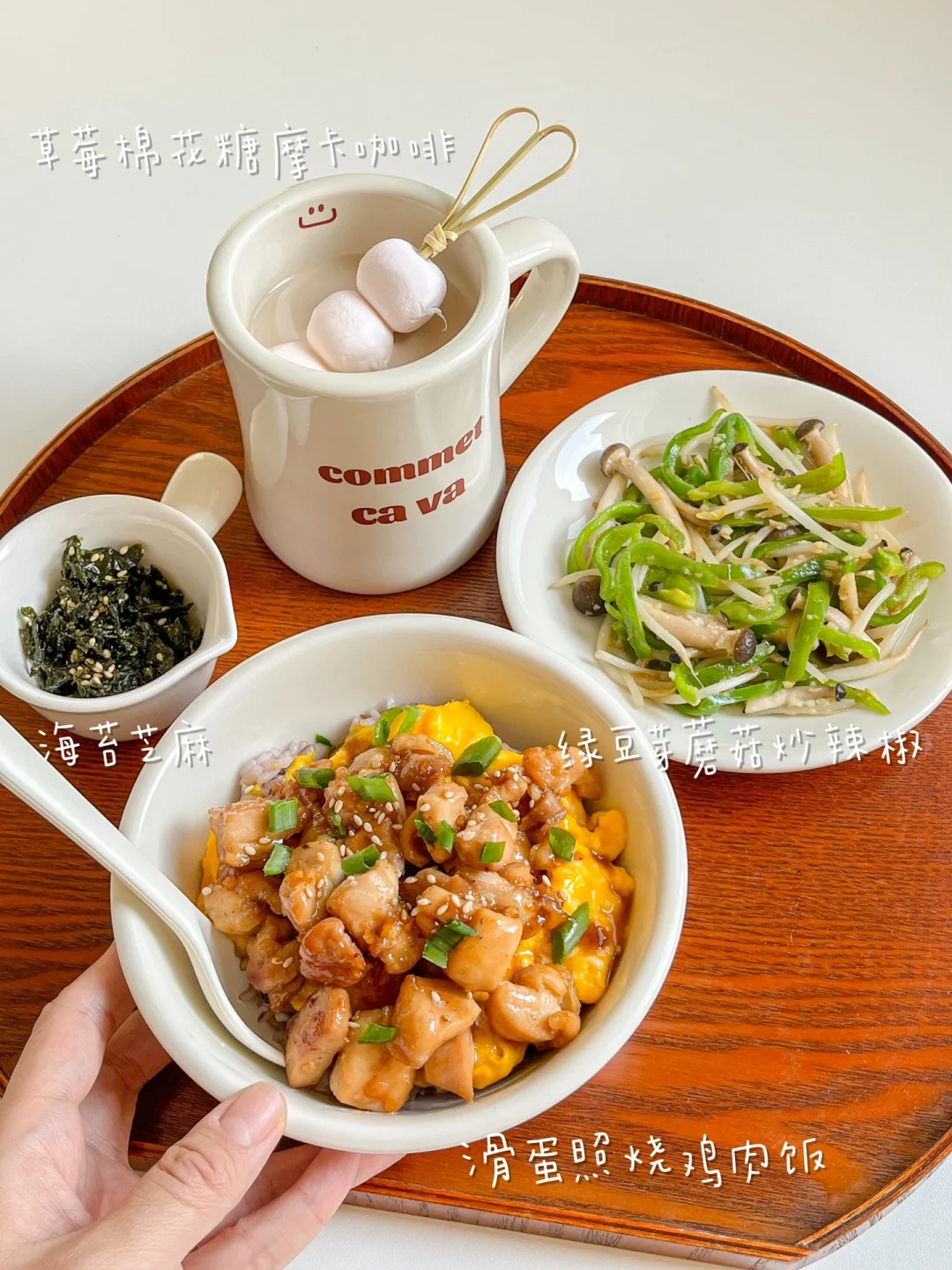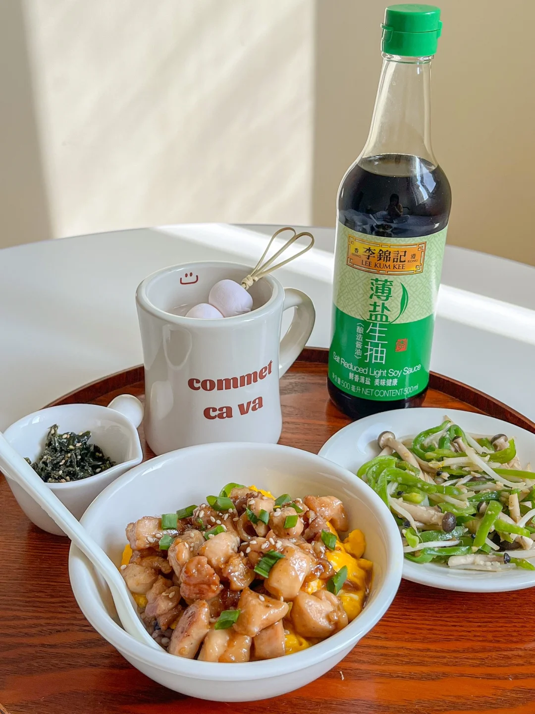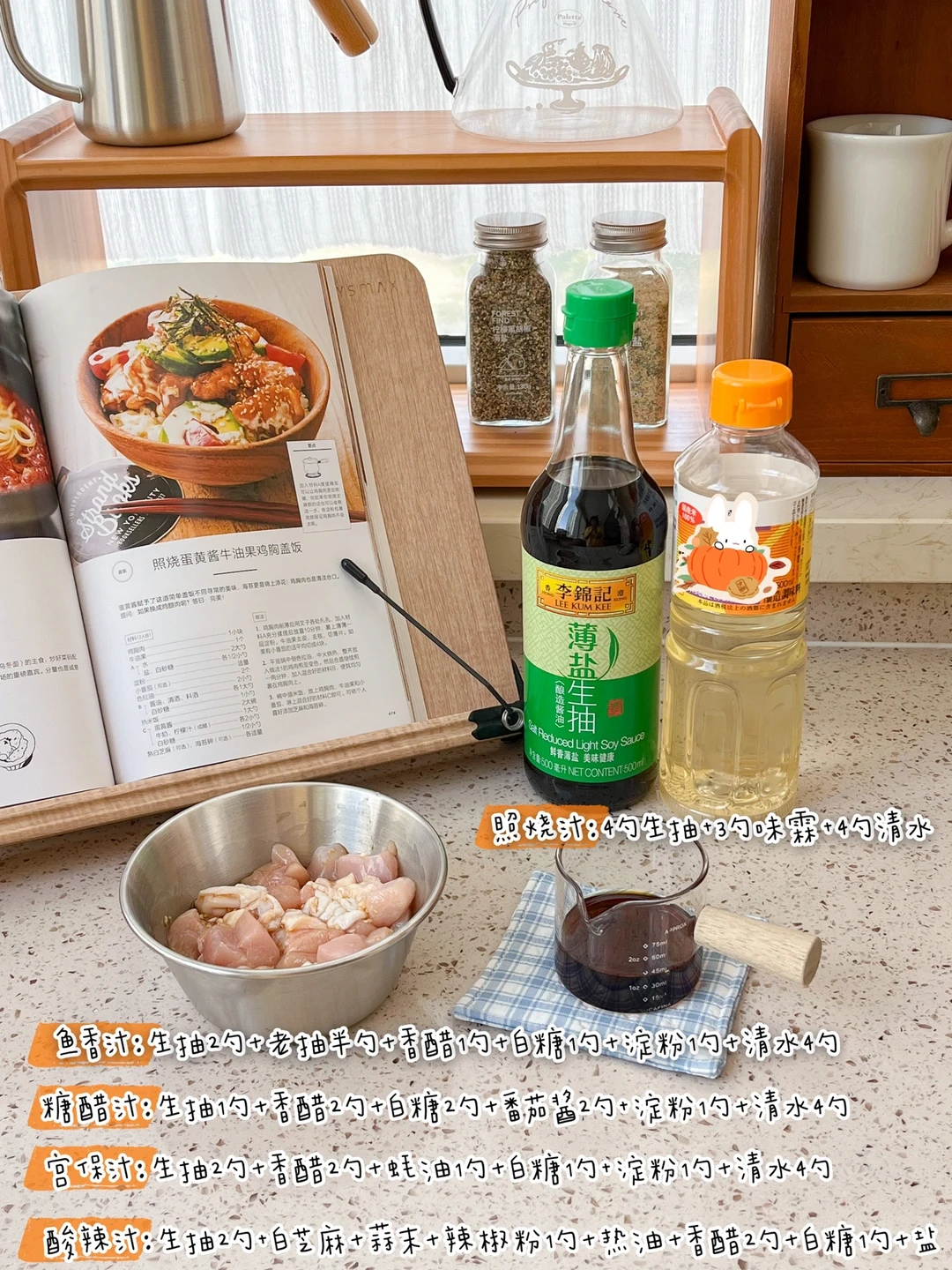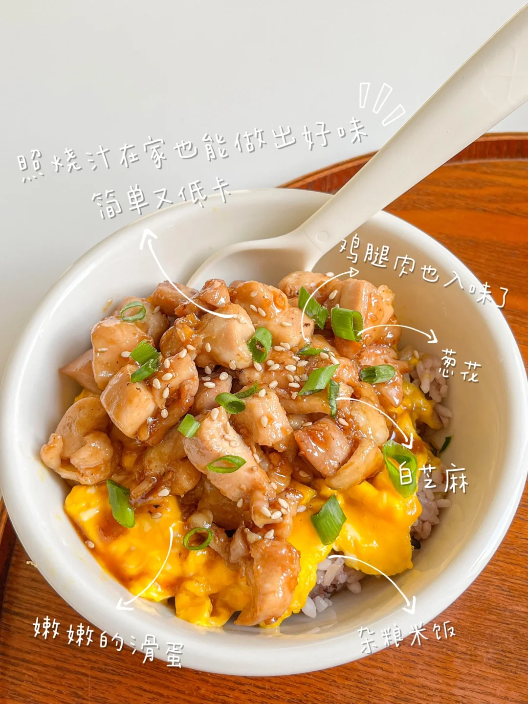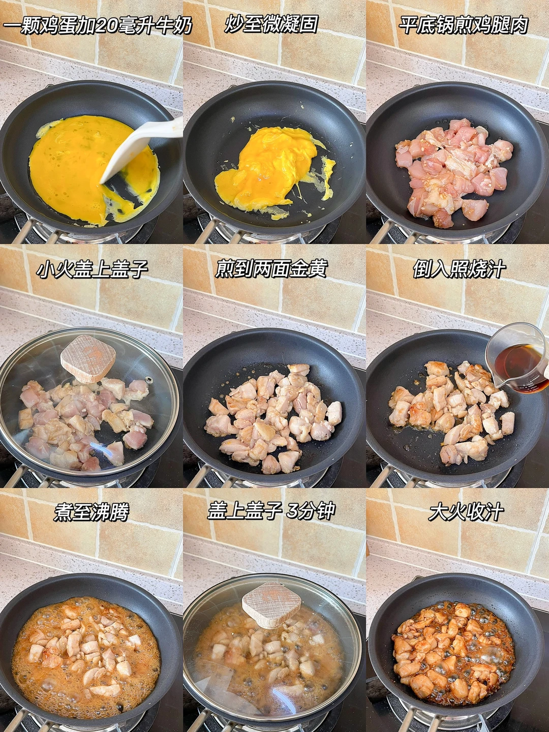 一颗鸡蛋加20毫升牛奶,滑炒出来更嫩。好吃的照烧酱用味霖和生抽在家就能调出来,4勺生抽+3勺味霖(两勺料酒+一勺蜂蜜可代替)+3勺清水,和炒好的鸡腿肉一起煮到粘稠。