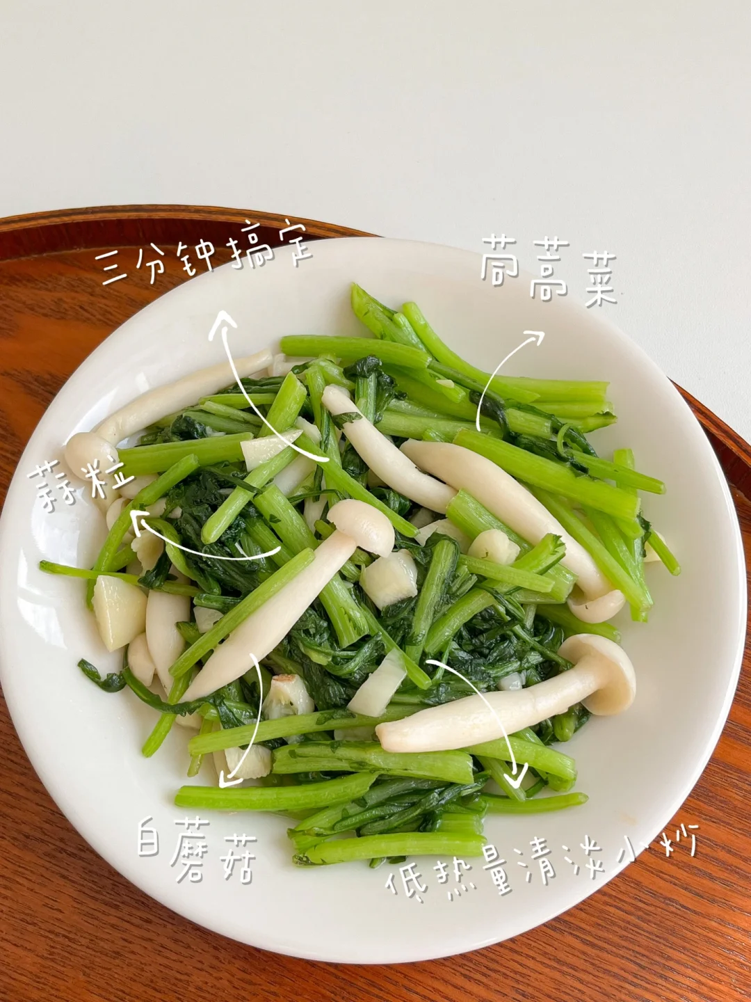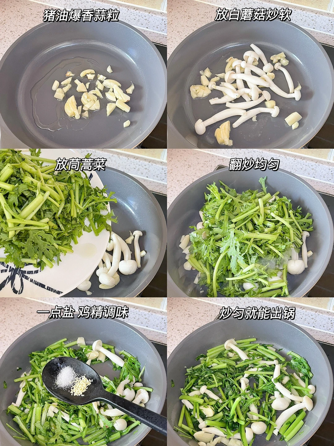 每天得换着样儿吃蔬菜,蒜蓉炒茼蒿算最简单的啦,三分钟就能搞定。用猪油炒很香,炒之前很大一盘,真的很缩水[笑哭R]家里有虾皮也可以放一点,补钙还鲜美~
