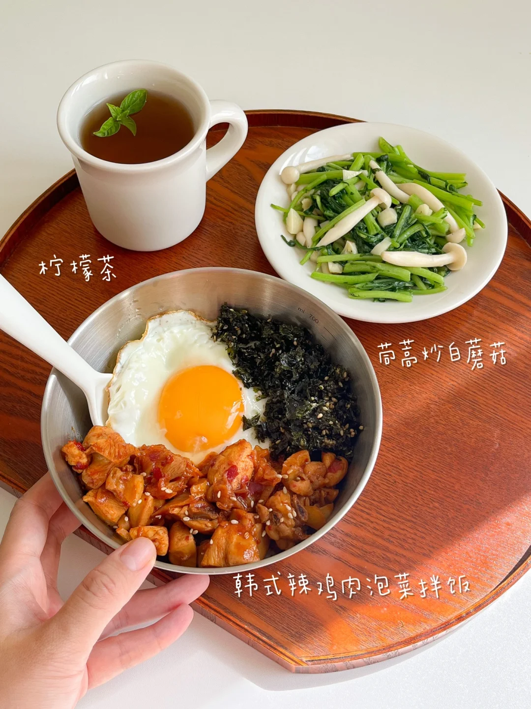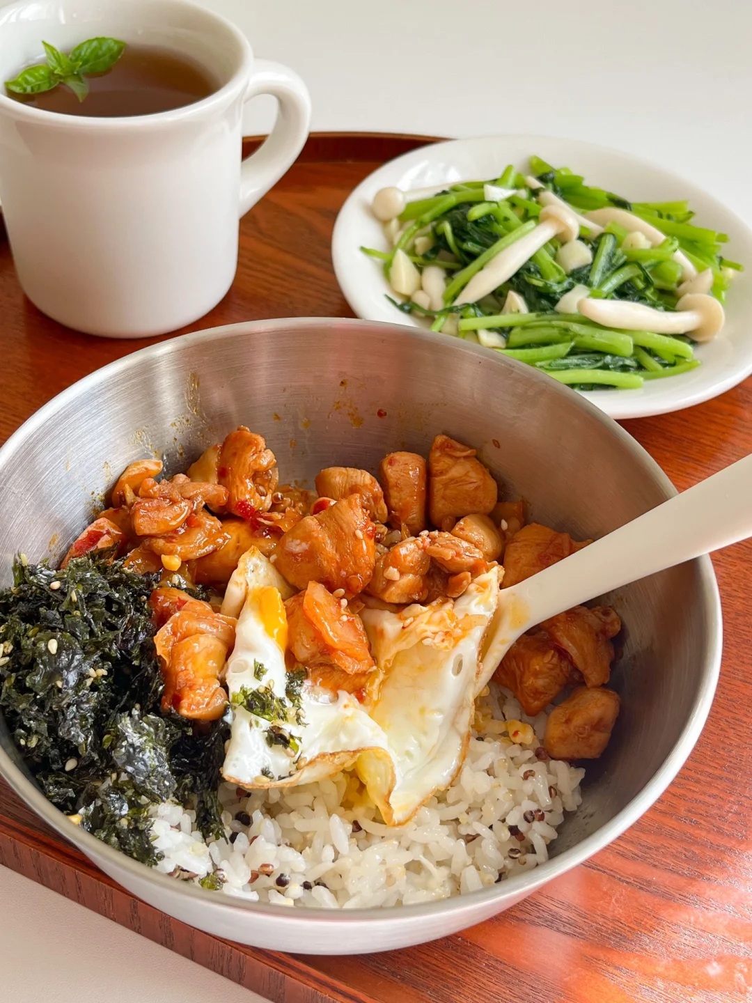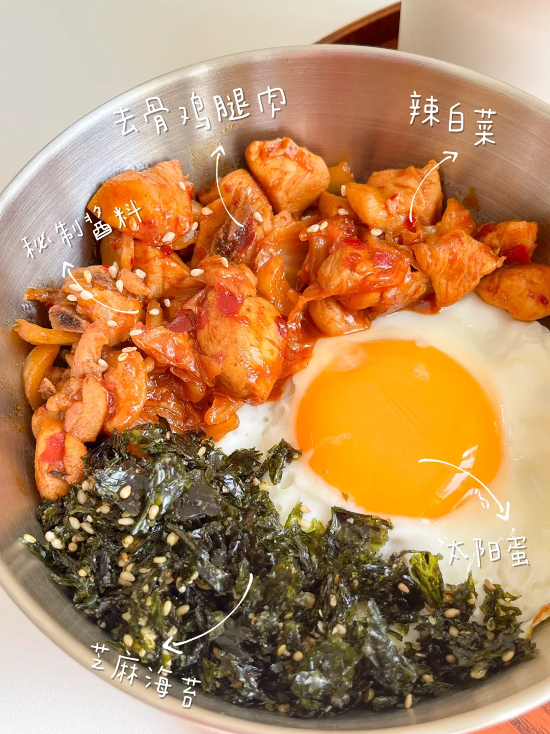 喜欢吃韩式拌饭的都可以试试今天这碗饭!煎的焦焦的鸡腿肉混合着酸酸辣辣泡菜的味道,还得拌着蛋黄吃[哇R]不怕热量高的可以换成五花肉会更香~减脂期可以用去骨鸡腿肉、鸡胸肉或牛肉都行