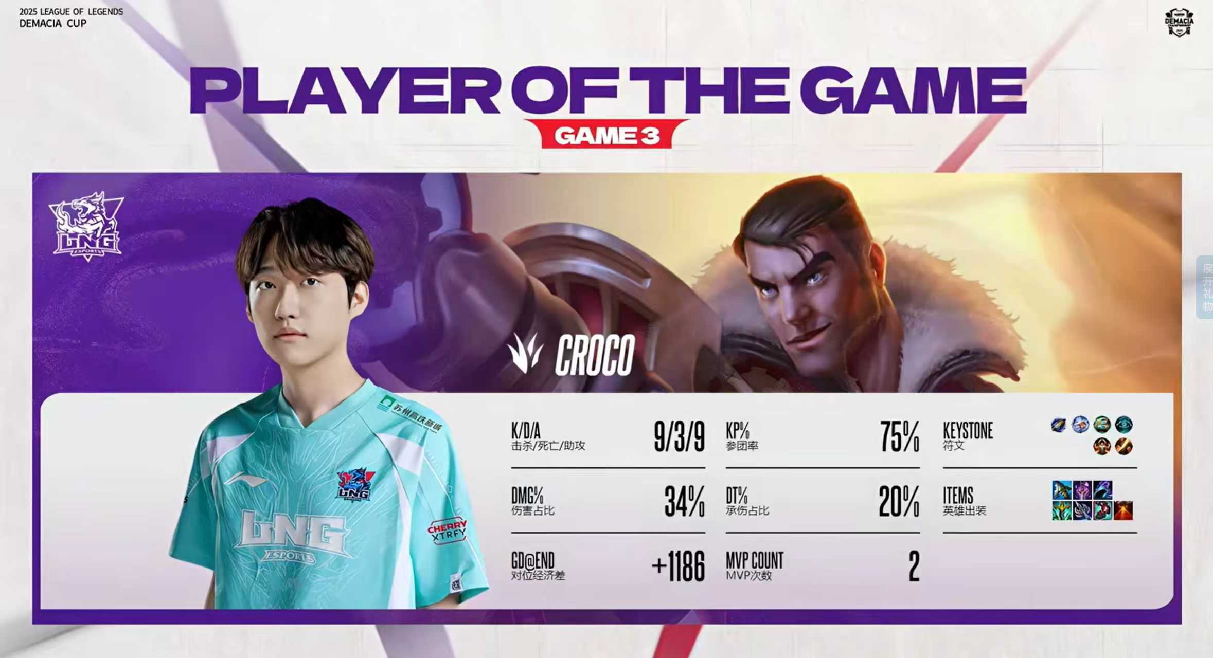 2025德玛西亚杯恭喜LNG2:1WE拿下这场比赛的胜利,MVP给到9/3