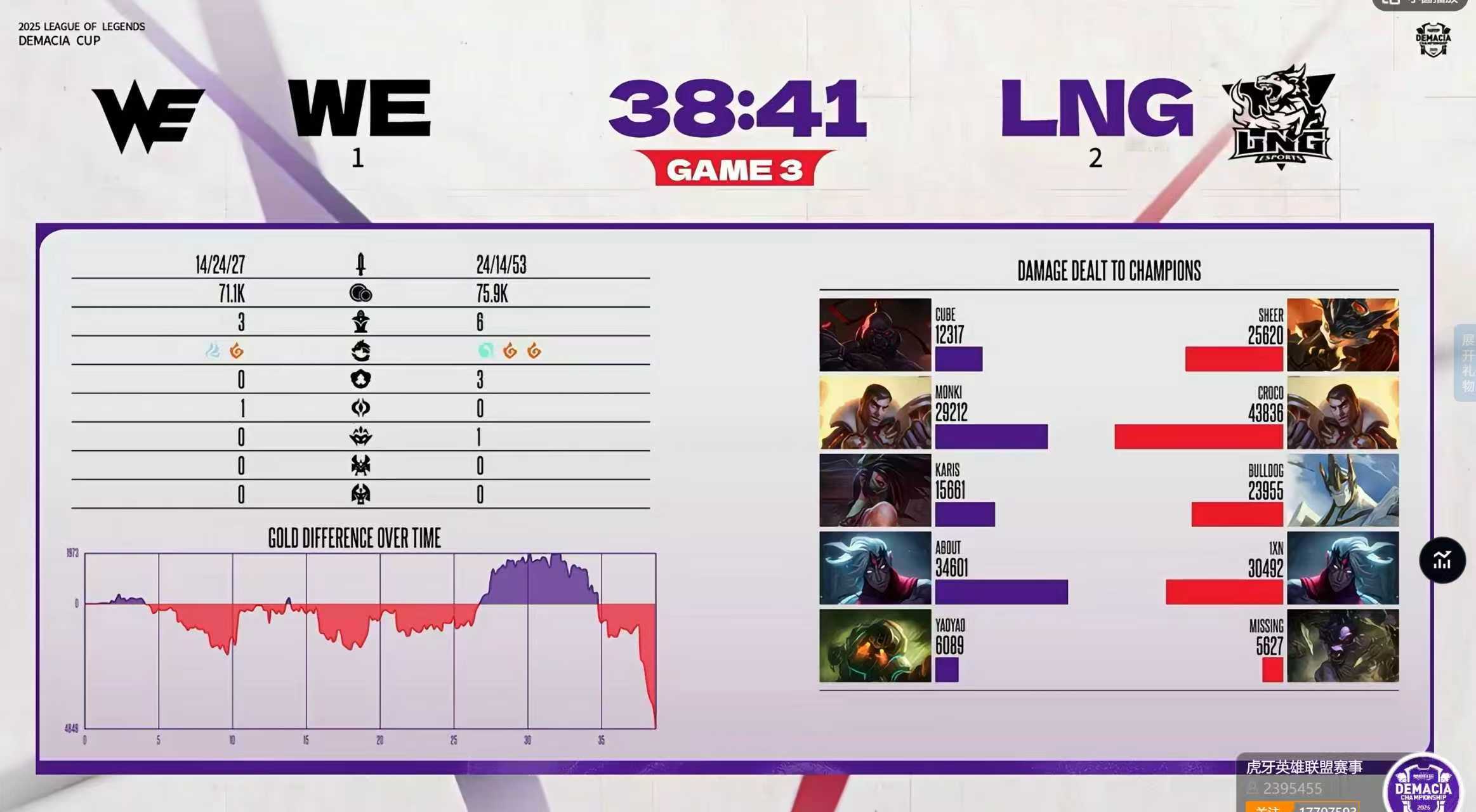 2025德玛西亚杯 恭喜LNG 2:1 WE拿下这场比赛的胜利,MVP给到9/3/9的杰斯we对战lng