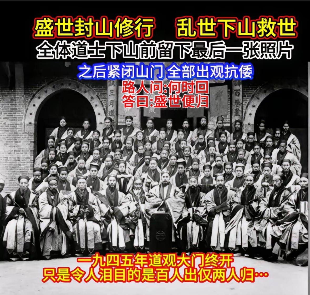 道家,盛世封山修行,乱世下山救世,全体道士下山前留下最后一张照片!道教作为中国土生土长的教派,在爱国这一块从不含糊,别看道士们平日就在深山老林里烧香拜神,一副与世无争看破红尘的模样,然而在鬼子侵华国破家亡之际,他们却毫不犹豫地挺身而出,一手烧香一手拿枪,斩妖除魔保家卫国,为抗日做出了巨大贡献。乱世道士下山救世,八仙宫道者皆兵,1937年贼寇踩随我华夏大地,八仙宫道者皆兵出道观抗日杀寇,1945年日寇无条件投降只有两位道长归来。国难当头,人不分男女,地不分东西,奋起抗战,不怕牺牲,英勇无畏。可歌可泣,名垂青史!