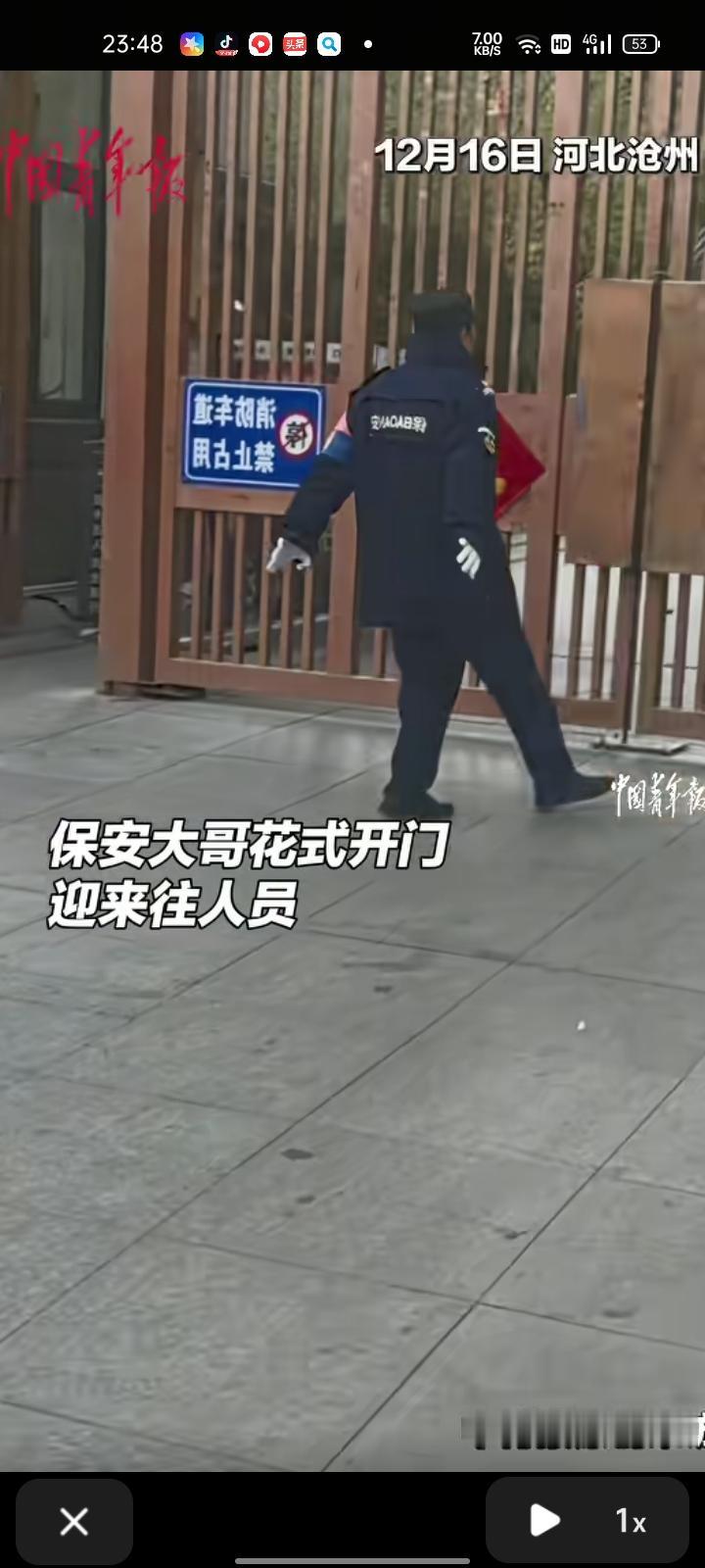 12月16日,河北沧州。网友晒视频称,小区保安花式开门迎接来往人员,很有精神头。不管外卖小哥还是快递小哥,待人方式都是里一样的,小区业主非常喜欢他,下班回来后看他都乐,最难得的是他对工作的坚持和态度