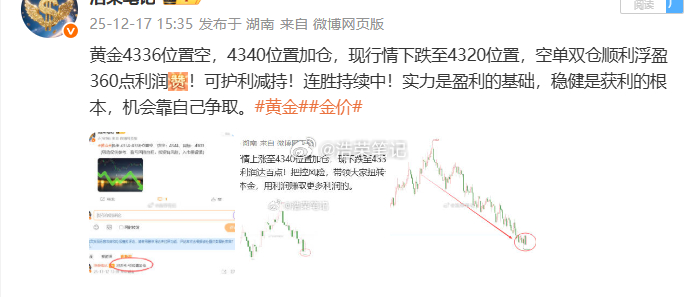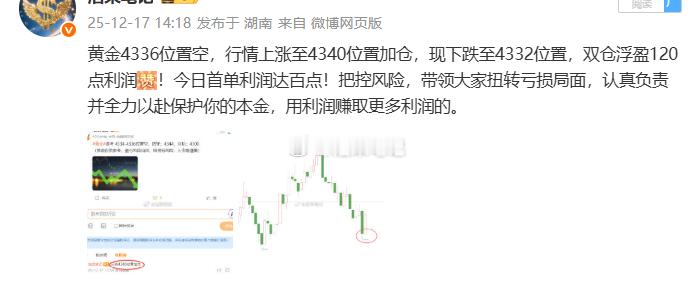 黄金4336位置空,4340位置加仓,现行情下跌至4311位置,空单双仓提前止盈540点利润!本个交易日开门红完美呈现!大家要是觉得浩荣的实力还行,可以点点关注!浩荣每天都会在微博更新策略,我的实力,由大家来亲眼见证!