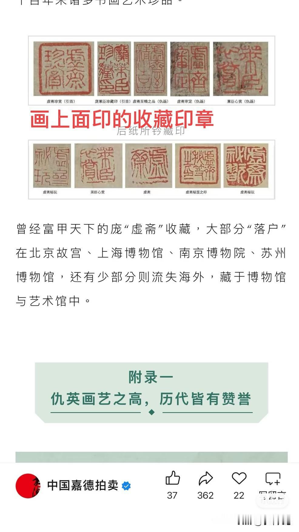 这下南京博物院这么多年的名声算是彻底砸了。 爱国人士捐给南京博物院的古画,离奇出现在拍卖会上,标价8000万。捐赠者后人去查验时发现,除了这幅被拍卖的画以外,还有另外四件古画也不知去向。 随后南京博物院回应:当年捐赠的这5幅画,经专家鉴定都是伪作。但网友扒出:拍卖的那幅古画上面,正好有捐赠人家族的收藏印【图二】,这基本就是实锤了。 捐给国家的那就是文物,为什么会流向拍卖市场?既然是博物院声称是伪作,又为什么当初不直接退还给捐赠者? 这下看南博怎么圆,如果最后没有一个公正的结果,以后谁还敢捐赠。