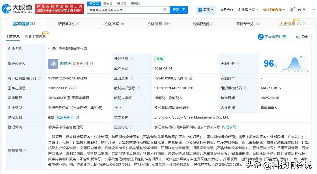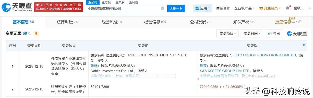 【中通供应链管理公司增资至7.3亿 增幅约21%】 天眼查App显示,近日,中通供应链管理有限公司发生工商变更,注册资本由约6亿人民币增至约7.3亿人民币,增幅约21%。 该公司成立于2016年5月,法定代表人为赖建法,经营范围包括供应链管理服务、企业管理、普通货物仓储服务、国内货物运输代理等。股东信息显示,该公司由杭州驰运股权投资有限公司、赖建法、赖梅松等共同持股。 天眼查信息: